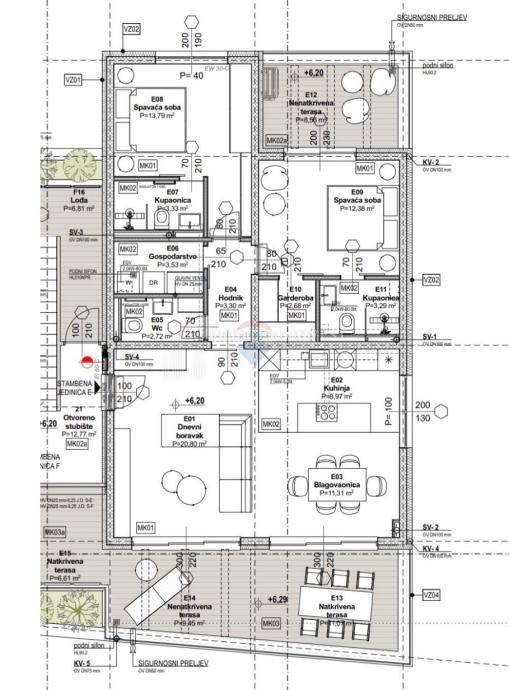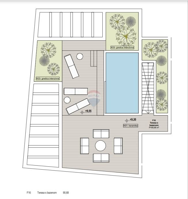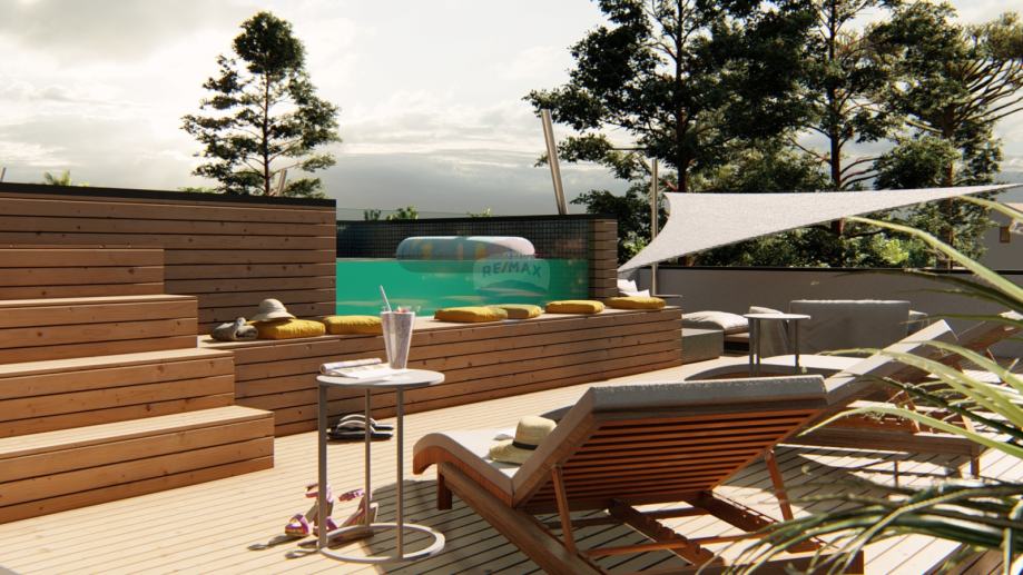 Vanjsko stubište vodi na krovnu terasu površine 93.27m2, na krovnoj terasi postoji priprema za instaliranje dodatnih sadržaja po želji (jacuzzi).