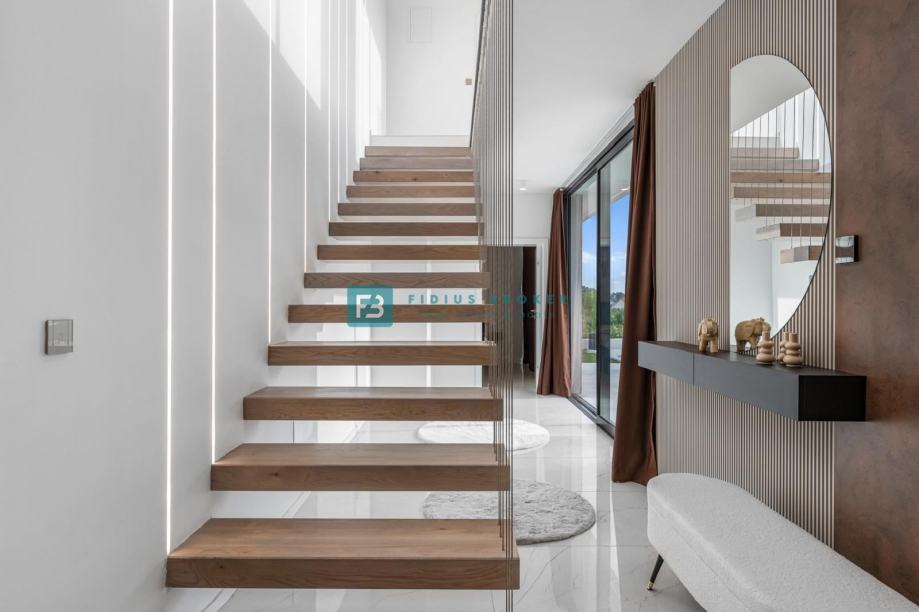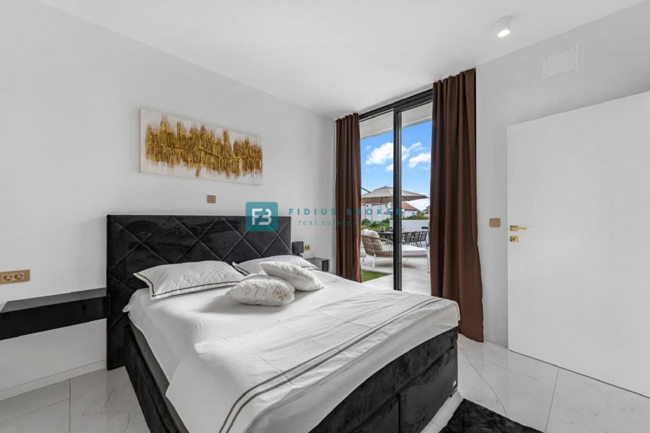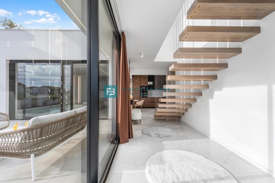 Vila ukupne korisne površine 182 m2 (stambene površine 150 m2) prostire se na dvije etaže: prizemlje + kat. U prizemlju se nalazi hodnik, kupaonica s praonicom, spavaća soba s vlastitom kupaonicom, prostrana kuhinja s blagovaonicom i dnevnim boravkom s izlazom na lijepu terasu i uređeno vanjsko dvorište cca 150 m2 u kojem je smješten bazen, sunčalište i roštilj. Unutarnjim stubištem dolazimo na kat gdje su se smjestile dvije spavaće sobe svaka sa kupaonicom i izlazom na natkrivenu terasu s koje se pruža predivan pogled na more. Vili pripadaju dva parkirna mjesta i u potpunosti je namještena i spremna za useljenje.