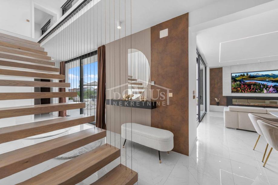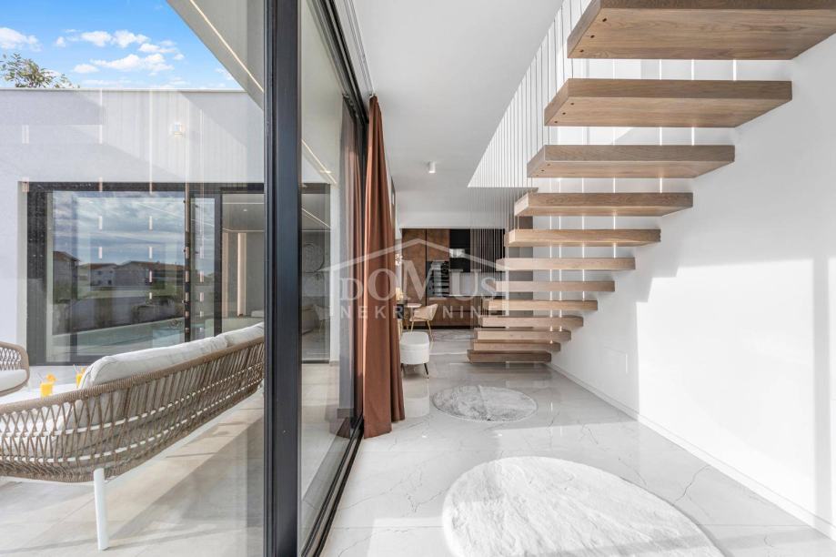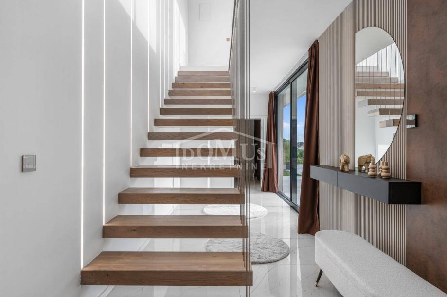 Unutarnje stepenice vode na 1. kat gdje se nalaze 3 spavaće sobe svaka sa kupaonicom i izlazom na natkrivenu terasu.