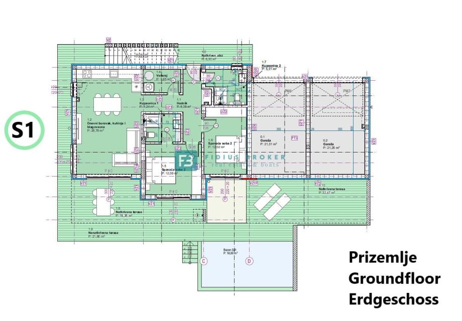 Novi projekt moderne stambene zgrade s ukupno 3 stambene jedinice. Stambeni objekt sastoji će se od tri etaže: prizemlje + 1. kat + 2. kat. Zgrada se gradi kvalitetnim materijalima prema posljednjim standardima gradnje: stiropor fasada, protupožarna i protuprovalna ulazna vrata, ALU stolarija s troslojnim staklom, ALU balkonska klizna vrata, električni podizači roleta s komarnicima, podovi obloženi prirodnim kamenom Plano, moderne kupaonske sanitarije, klima uređaj u spavaćim sobama i dnevnom boravku, TV priključak u spavaćim sobama i dnevnom boravku, vodeno podno grijanje, staklene ograde na terasama. Stan S1 ima dva vanjska parking mjesta unutar dvorišta zgrade, dok stanovi S2 i S3 posjeduju po jedno parking mjesto i jedno garažno mjesto.