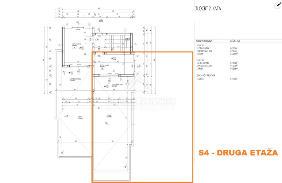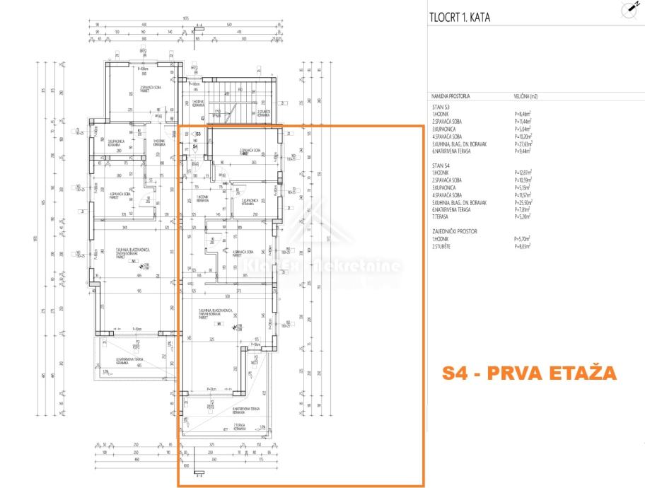 Stambena jedinica S4- dvoetažni, dvosobni stan na prvom i drugom katu zgrade jugoistočne orjentacije. Stan posjeduje neto površinu od 107.71 m2, a sastoji se od: prvog kata na kojem se nalaze: hodnik, kupaonica, dvije spavaće sobe, , kuhinja s blagovaonicom i dnevni boravak iz kojeg se izlazi na terasu površine 5.20 m2. Unutarnje stepenice vode do druge etaže stana na kojem se nalaze velika prohodna terasa natkrivene površine 12.20 m2 i nenatkrivene površine 52.63 m2 kao i ljetna kuhinja površine 14.58 m/2. S terase se pruža pogled na more i okolinu. Stanu pripada jedno parkirno mjesto.