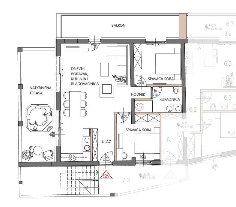 S6- površine 71 m2, smješten na drugon katu, ulaza i hodnika, spavaće sobe, kupaonice, dnevnog boravka, kuhinje i blagovaonice, terase, balkona, 1 parkirnog mjesta ispred zgrade. = Cijena: 360.000, 00 €