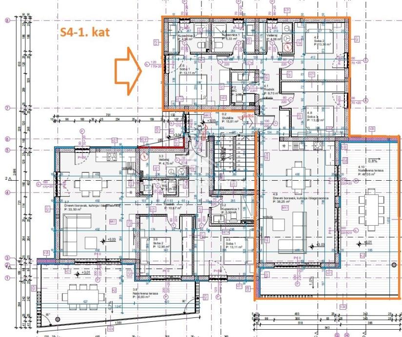 Stan S4- trosoban stan na prvom katu stambene zgrade neto površine 133 m/2. Stan se sastoji od ulaznog pretprostora, tri spavaće sobe od kojih je jedna master spavaća soba s vlastitom kupaonicom, zajedničke kupaonice, praonice , WC-a te velikog dnevnog boravka iz kojeg se izlazi na natkrivenu terasu površine 46.05 m/2. Stanu pripadaju dva parkirna mjesta.