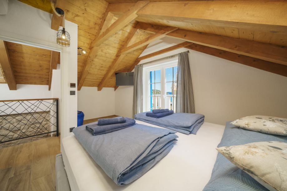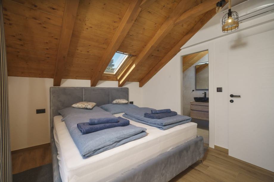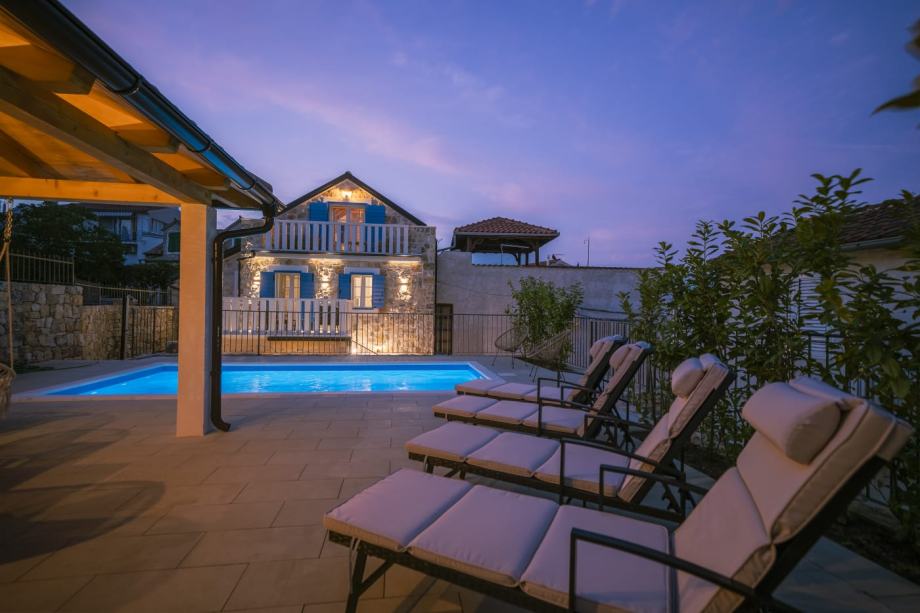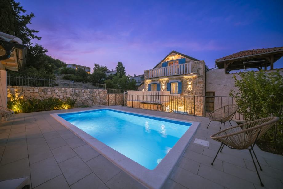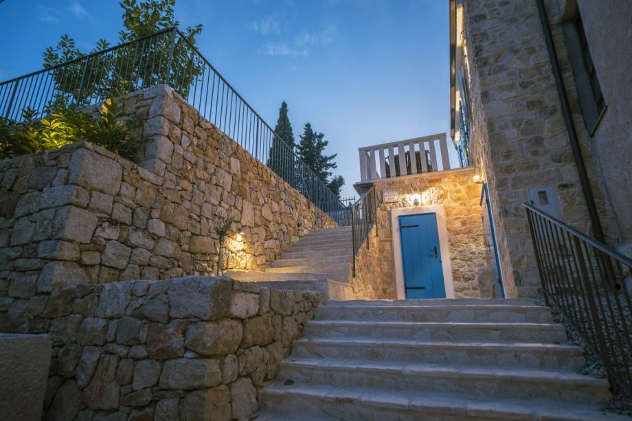 Kuća je pomno renovirana i potpuno uređena, zadržavajući autohtoni ambijent uz vrhunsku opremu, koja čini savršen spoj rustikalnog i istinski dalmatinskog stila s luksuznim detaljima. Prizemlje se sastoji od kuhinje, dnevne sobe, blagovaonice s unutarnjim kaminom/roštiljem i vinotekom, toaleta i ostave. Unutarnje stubište vodi na prvi kat, gdje se nalaze hodnik, kupaonica te dvije spavaće sobe, svaka s vlastitom terasom. U potkrovlju je prostrana spavaća soba s vlastitom kupaonicom i terasom koja nudi pogled na dvorište, bazen i more.