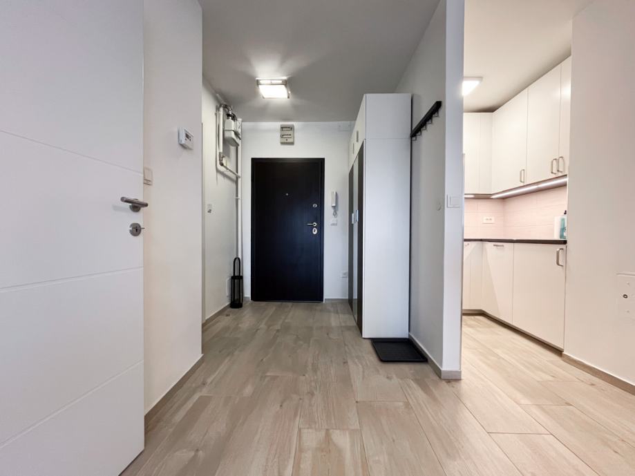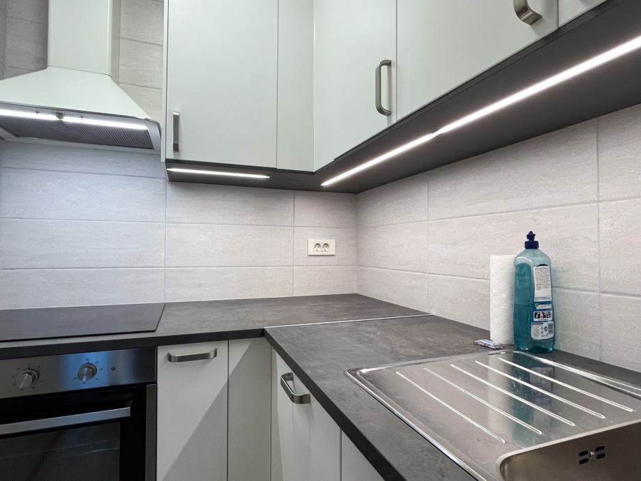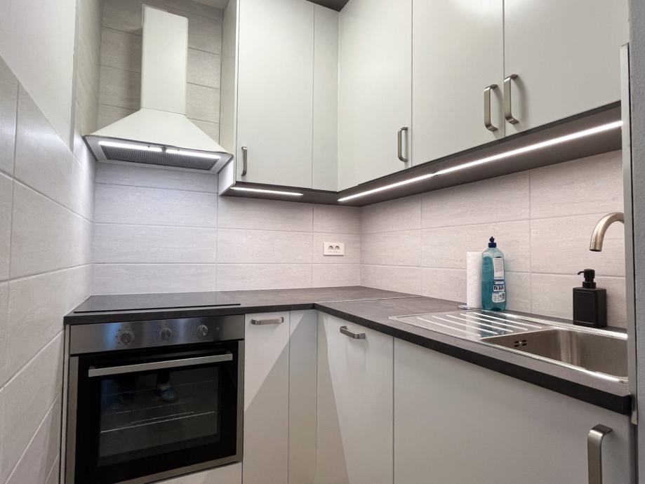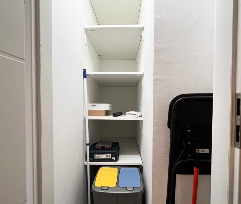 Stan je klimatiziran i potpuno renoviran 2025. godine. Površine je 45 m2, a sastoji se od dnevnog boravka s kuhinjom i blagovaonskim šankom, spavaće sobe s bračnim krevetom, kupaonice s kadom sa staklenim paravanom i toaletom te ostave.