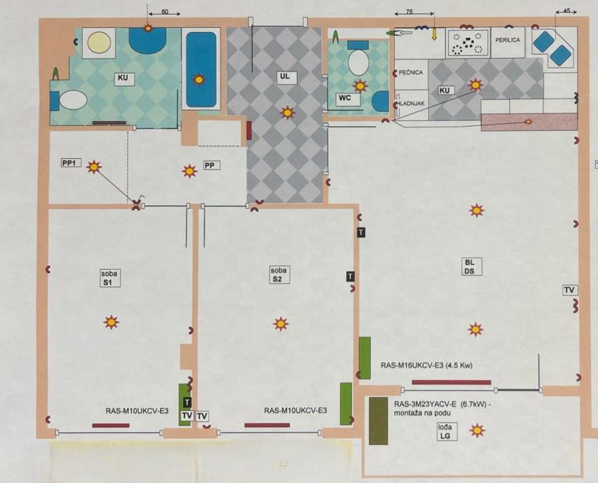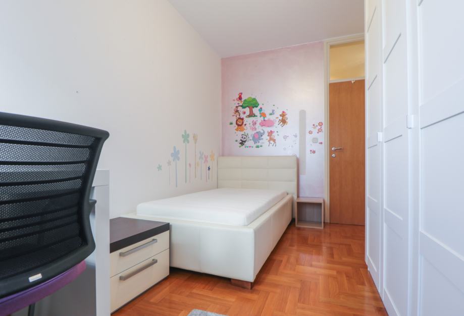Stan je potpuno namješten, opremljen je s čak tri klime, PVC stolarijom, ugradbenim ormarima, protuprovalnim vratima, video-portafonom, perilicom suđa, perilicom veša, pećnicom, štednjakom, napom i sl.