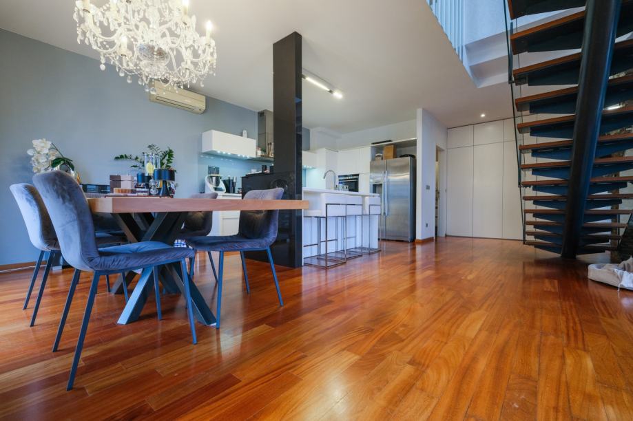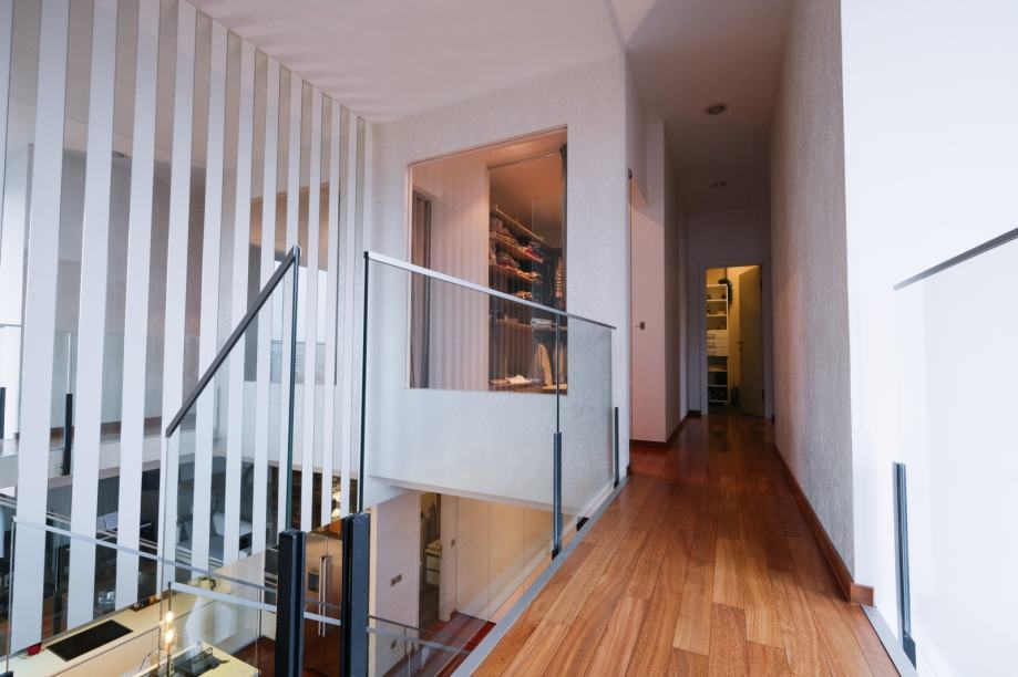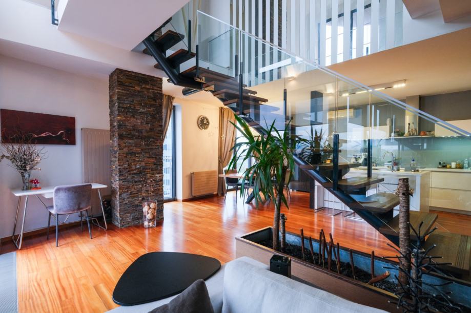 Odličan tlocrt smisleno povezuje prostor tvoreći jedinstvenu nekretninu koja se proteže na dvije etaže, uokvirena velikim staklenim stijenama i visokim stropovima koji stan čine elegantnim, ugodnim i prozračnim s mnogo svjetla. Sofisticiran dojam koji stan pruža zaokružen je modernim i decentnim uređenjem te efektnim stepeništem.