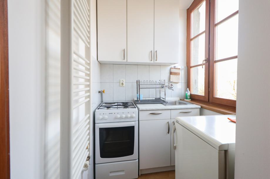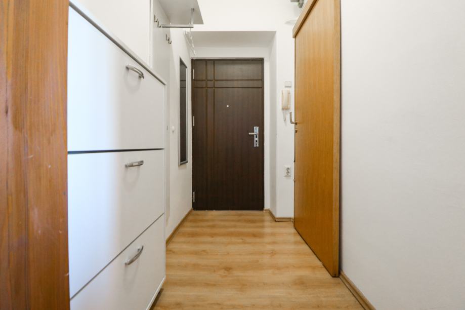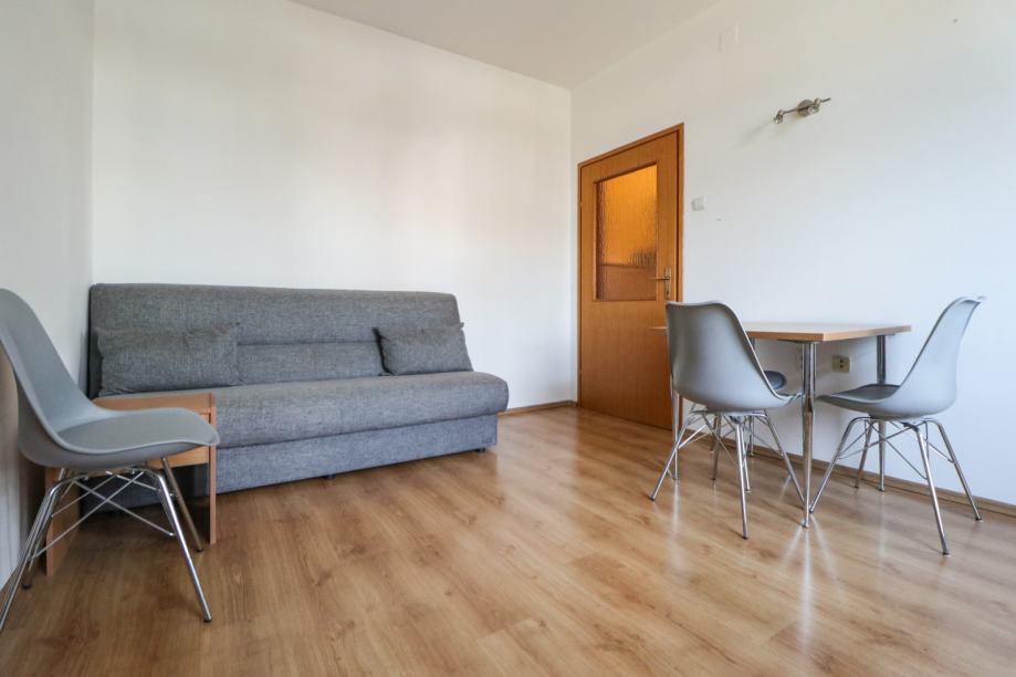 Stan je svjetao i uredan. Površine je 43 m2, a sastoji se od ulaznog hodnika, kupaonice s toaletom, dnevnog boravka s blagovaonskim dijelom, manje kuhinje i velike spavaće sobe.