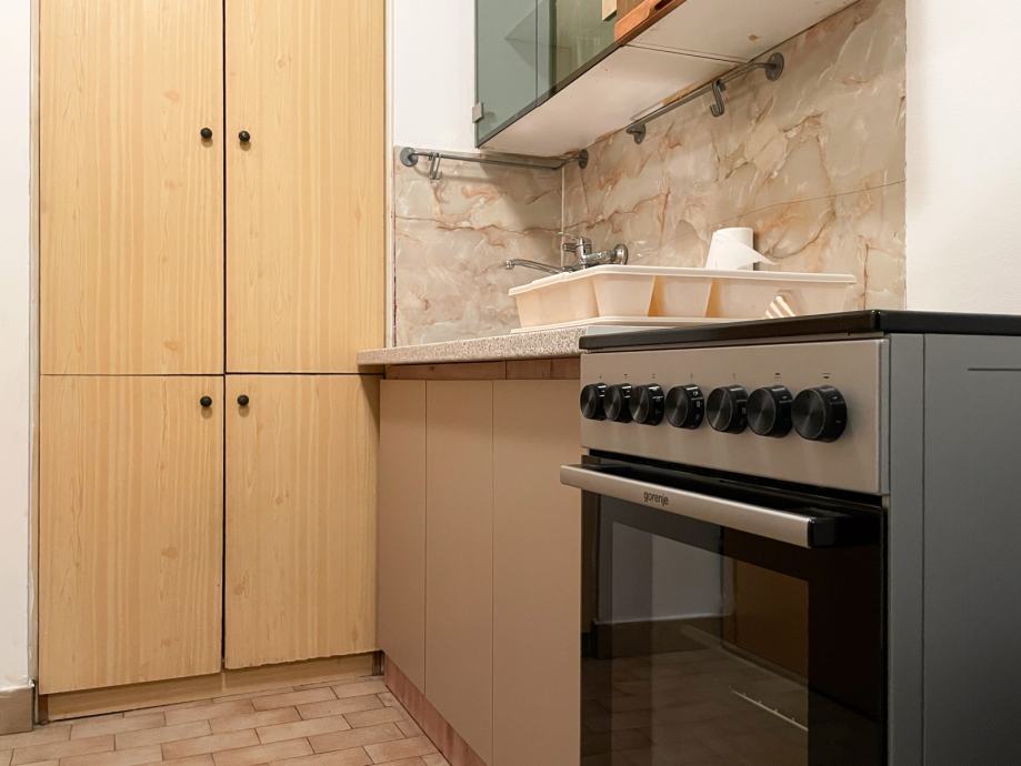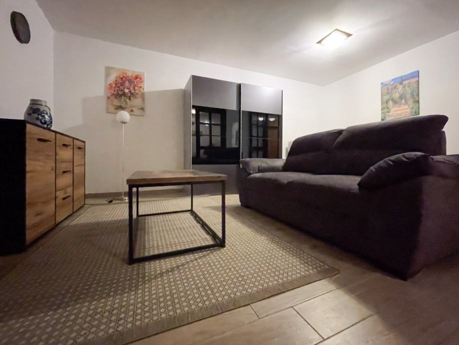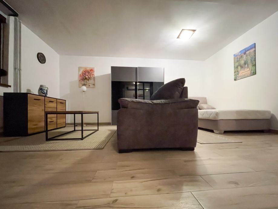 U dnevnom boravku nalazi se novi namještaj: dvosjed, komoda, ormar te krevet. Iz stana se pruža pogled na dio zelene površine.