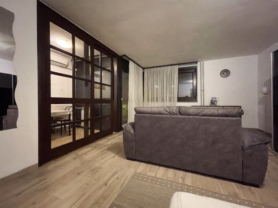 U dnevnom boravku nalazi se novi namještaj: dvosjed, komoda, ormar te krevet. A stan je dodatno opremljen novim TV-om, peglom+daskom za peglanje, posteljinom... Uskoro stižu i stolice za lođu.