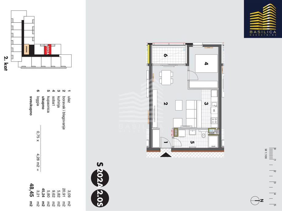 Stan oznake S202A nalazi se na 2. katu te se sastoji od: hodnika, sobe, dnevnog boravka sa kuhinjom i blagovaonicom, kupaonice i lođe, ukupne prodajne površine 48,45m2