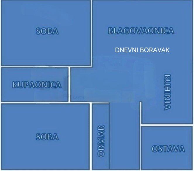 Sastoji se od dvije sobe, open space dnevna soba s kuhinjom i blagovaonicom, špajza, kupaonica, hodnik.