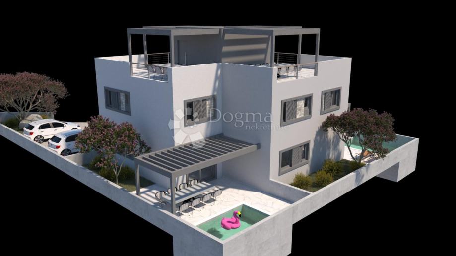 Ova moderna nekretnina nudi privatnost kuće uz funkcionalnost stana — zaseban ulaz, vlastito dvorište i tri etaže koje pružaju komfor i jasan osjećaj luksuza. U prizemlju površine 47,6 m² nalazi se prostrani dnevni boravak s kuhinjom i blagovaonicom (30,8 m²), kupaonica, spremište i ulazni prostor, s izravnim izlazom na privatno dvorište cca 200 m² s bazenom i sunčalištem.