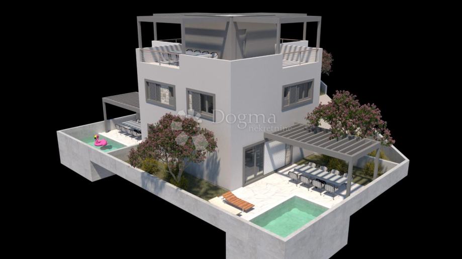 Gornja etaža od 50,7 m² sastoji se od tri spavaće sobe, dvije kupaonice i hodnika sa stubištem, što ovu nekretninu čini idealnom za obiteljski život ili turistički najam višeg standarda. Posebnu vrijednost daje treća etaža — impresivna privatna krovna terasa od 45,8 m² s otvorenim pogledom na more i zalazak sunca, predviđena za lounge zonu, ljetnu kuhinju ili jacuzzi. Upravo ova rooftop terasa daje nekretnini karakter kuće, a ne klasičnog stana.