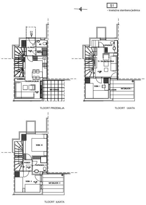 Na drugoj etaži nalaze se prolazni dnevni boravak, spavaća soba, kupaonica s wc-om i natkriveni balkon. Treća etaža sastoji se od dvije spavaće sobe, kupaonice i balkona.