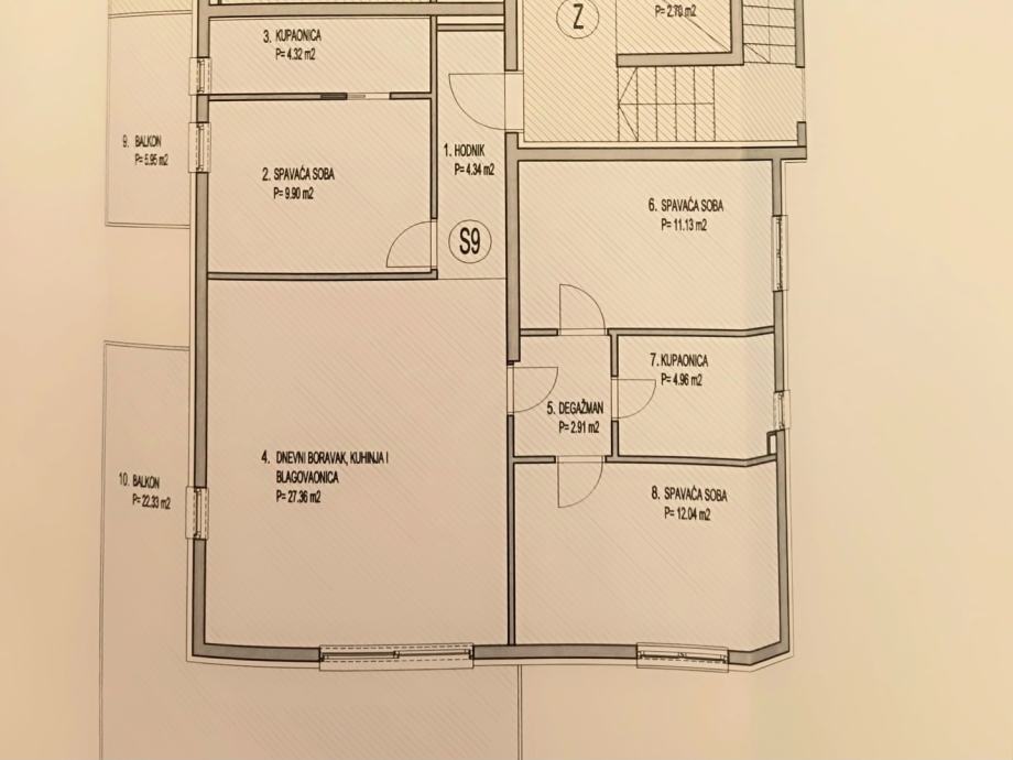 Sastoji se od ulaznog hodnika, open space boravka s izlazom na veći balkon (25m2 podne površine), dvije spavaće sobe s još jednim balkonom i dvije kupaonice s toaletom.