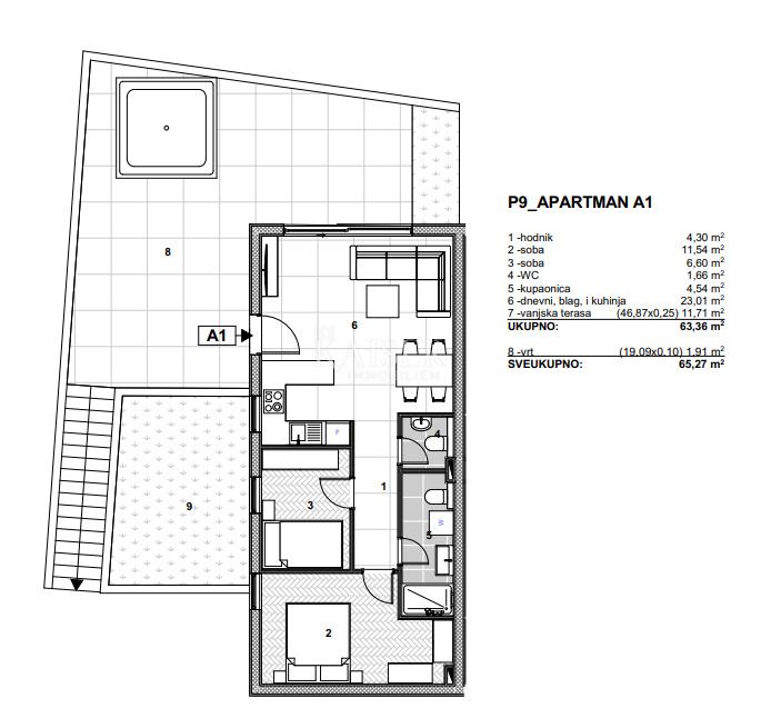 Iz ponude posebno izdvajamo P9_APARTMAN A1, atraktivnu prizemnu jedinicu idealnu za obitelji, parove ili vlasnike koji traže dodatni vanjski prostor. Apartman se sastoji od: