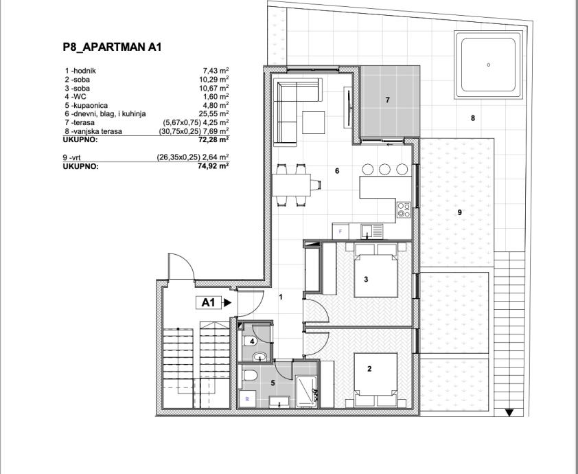 Komforan dvosoban stan neto korisne površine 74,97 m2, bruto površine 126,27 m2. Sastoji se od hodnika, dvije spavaće sobe, wc-a, kupaonice, dnevnog boravka, kuhinje, blagovaonice, terase i prostranog vrta. Stanu pripada jedno vanjsko parkirno mjesto uz mogućnost kupovine dodatnog parkirnog...
