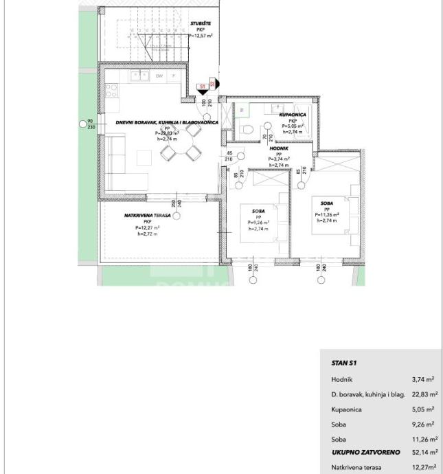 Unutarnja površina stana iznosi 52,14 m2, a natkrivene terase 12,27 m2.