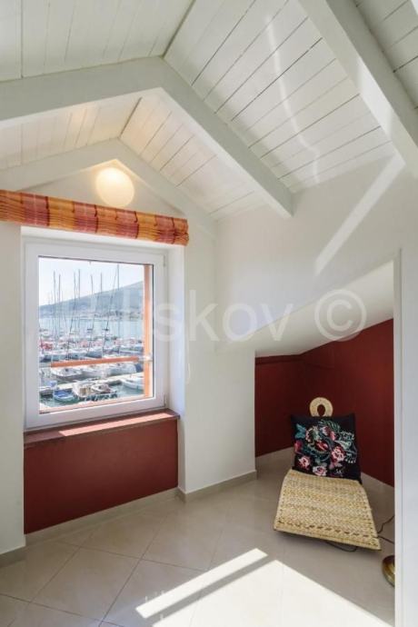 Smještena u prvom redu uz more, ova kuća se proteže na prizemlje i tri kata, nudeći jedinstven pogled na UNESCO centar Trogira i trogirsku rivu. Prizemlje je rezervirano za poslovni prostor, idealno za one koji žele raditi s pogledom na more ili koji planiraju razviti vlastiti posao u turističkom okruženju.