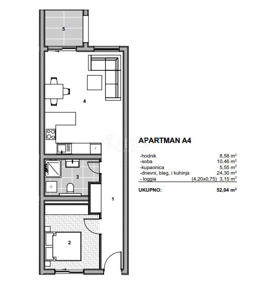Iz ponude dodatno izdvajamo APARTMAN A4, savršeno rješenje za parove ili pojedince koji žele kvalitetan prostor u modernom objektu uz more. Apartman se sastoji od: