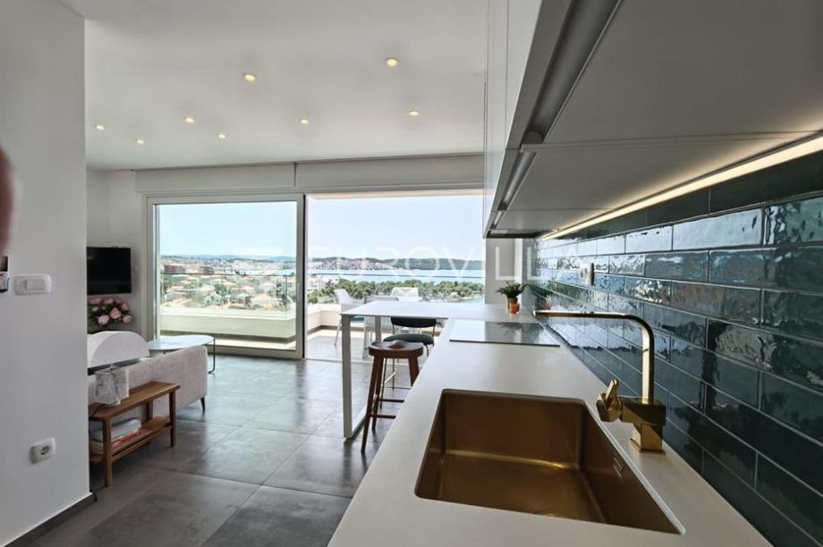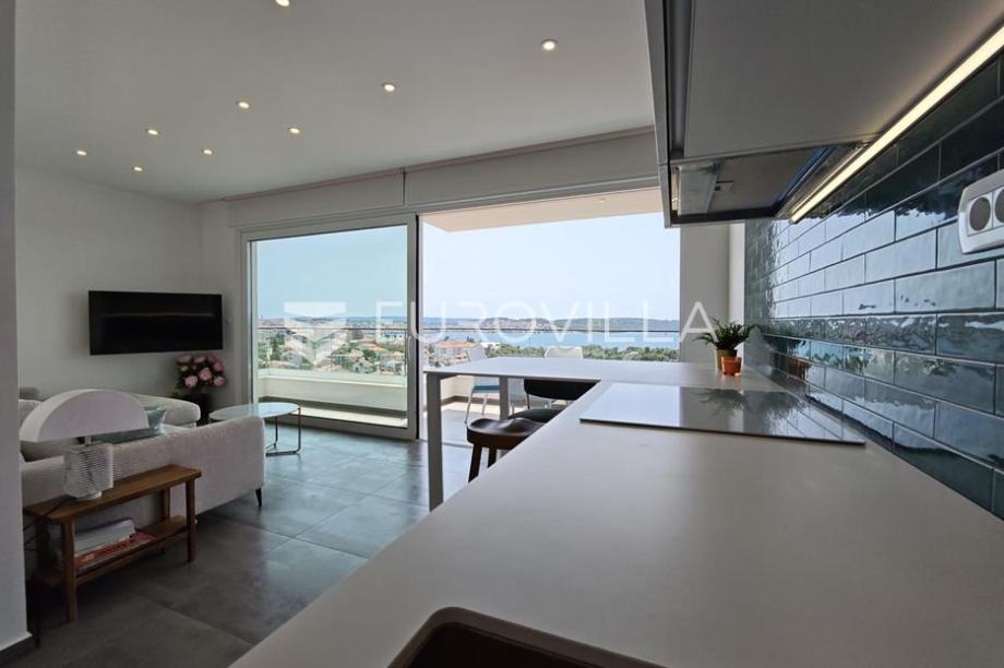 Trogir, Čiovo, moderno uređen i potpuno opremljen dvosoban stan u novoizgrađenom objektu. Položen je na drugom katu stambene zgrade s garažom i vanjskim bazenom.Stan se sastoji od hodnika, kupaonice, dvije spavaće sobe, dnevnog boravka i kuhinje s izlazom na natkrivenu terasu površine 9 m2. Stanu pripada privatna krovna terasa s vanjskim tušem i jacuzzi-em, jedno vanjsko parkirno mjesto, te jedno garažno parkirno mjesto. Pogled na more je otvoren s obje etaže, i gotovo svake prostorije u stanu.Lokacija odlična, na samo nekoliko minuta hoda do uređene plaže, kafića, trgovina i restorana.Vlasništvo uredno.Stojimo vam na raspolaganju za sve dodatne informacije....