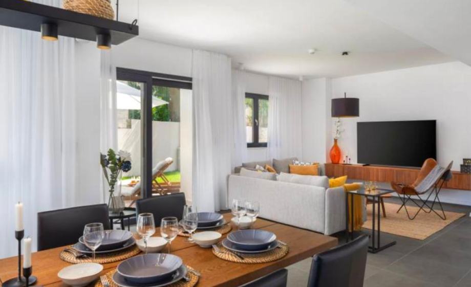 The ground floor leads to a large terrace and cultivated garden, where there is also an outdoor pool.