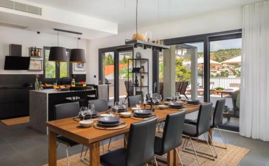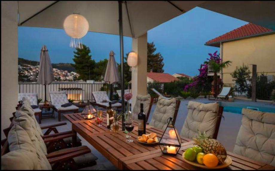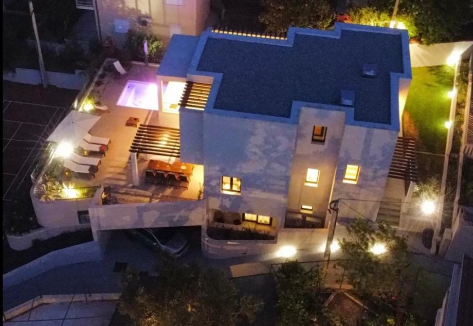 Iz prizemlja se izlazi na veliku terasu i kultiviranu okućnicu, gdje se nalazi i vanjski bazen.
