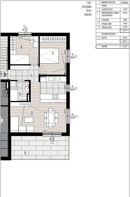 - NETTO POVRŠINA STANA: 57,37 m2
