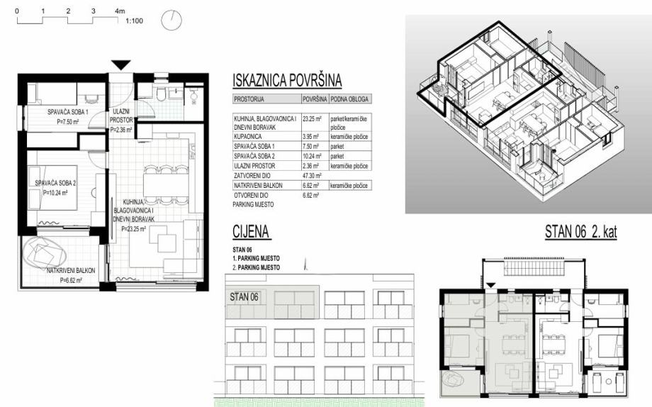 S06 Posredujemo u prodaji dvosobnog stana zatvorene površine 47.30m2, s balkonom 6.62m2,ukupne neto površine cca.51m2 te s dva parkirna mjesta.