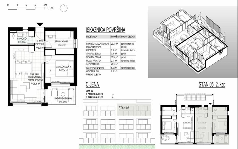 S05 Posredujemo u prodaji dvosobnog stana zatvorene površine 47.30m2, s balkonom 6.62m2,ukupne neto površine cca.51m2 te s dva parkirna mjesta.