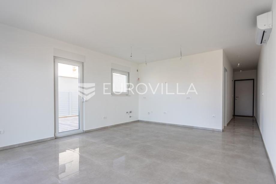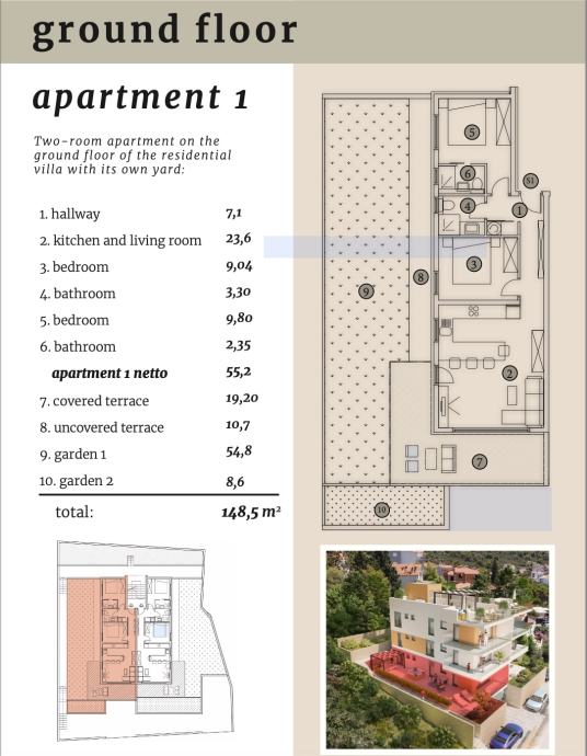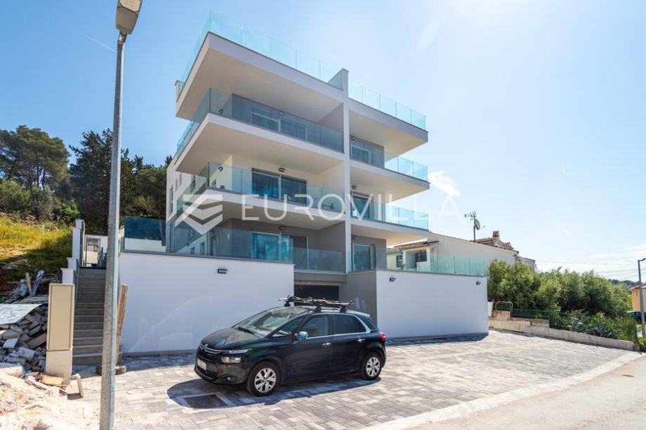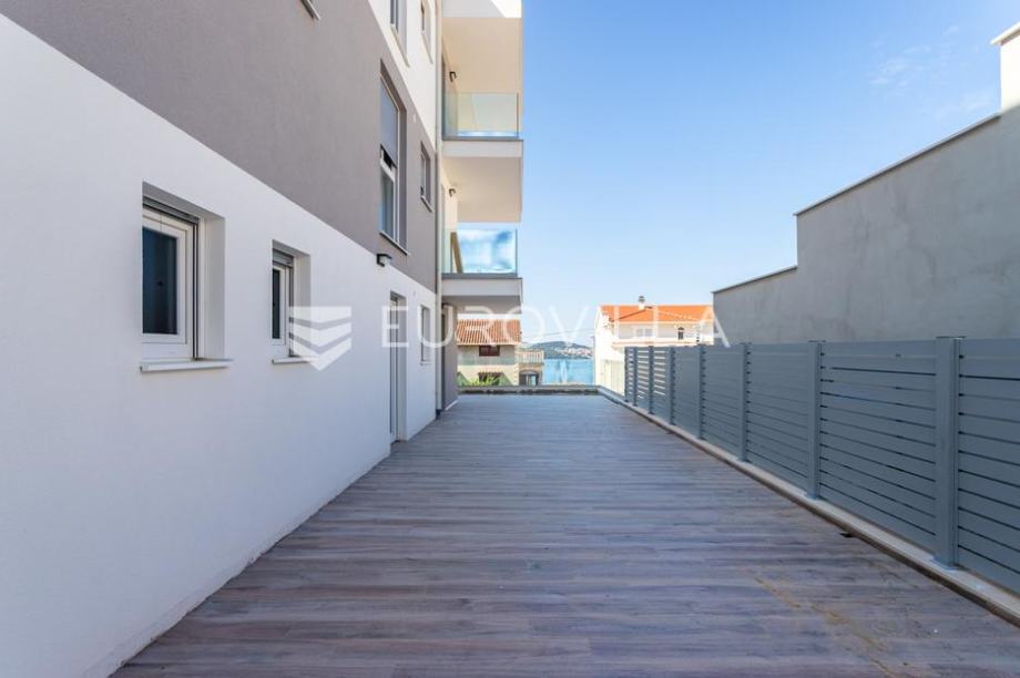 Trogir, dvosoban stan u prizemlju modernog stambenog objekta s predivnim pogleodm na more.Sastoji se od hodnika, dvije spavaće sobe, wc-a, kupaonice, kuhinje s blagovaonicom, dnevnog boravka i terase ( 29,90 m2 ). Pripada mu vrt površine 64, 4 m2, kao i jedno nenatkriveno vanjsko parkirno mjesto....Za ovu nekretninu kontaktirajte asistenta u prodaji na broj telefona +385 91 615 6253.Više na Eurovilla.hr, ID: 901405Direktan link: https://eurovilla.hr/nekretnina/trogir-dvosoban-stan-u-prizemlju-s-terasom/901405/-----Trogir, two-bedroom apartment on the ground floor of a modern residential building with a beautiful sea view.It consists of a hallway, two bedrooms, toilet, bathroom, kitchen with dining room, living room and terrace (29.90 m2). It has a garden of 64.4 m2, as well as one uncovered outdoor parking... For this property contact our agent on telephone number +385 91 615 6253.More on Eurovilla.hr, ID: 901405Direct link: https://eurovilla.hr/en/property/trogir-two-room-apartment-on-the-ground-floor/901405/...