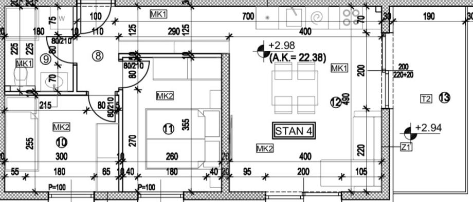 Trogir, dvosobni stan na prvom katu stambene zgrade.Z4 - S4 - stan ima funkcionalan raspored i sastoji se od ulaznog hodnika, dvije spavaće sobe, kupaonice, kuhinje s blagovaonicom i dnevnog boravka s izlazom na natkriveni balkon od 9,32 m2.Površina zatvorenog stambenog prostora iznosi 46,63.U...