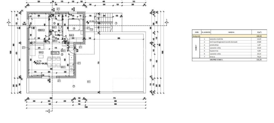Stan se sastoji od hodnika, dvije spavaće sobe, kupaonice s wcom, dnevnog boravka s kuhinjom i blagavaonom, kao i prostrane terase površine 79,25 m2.