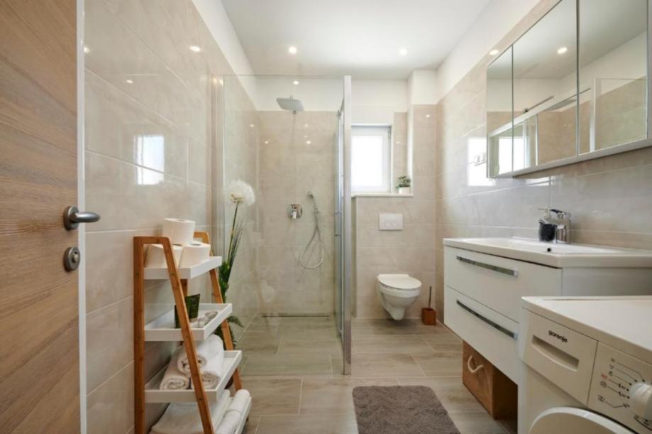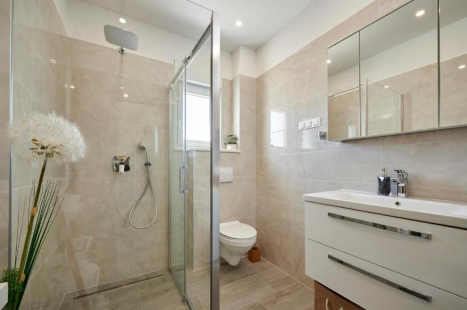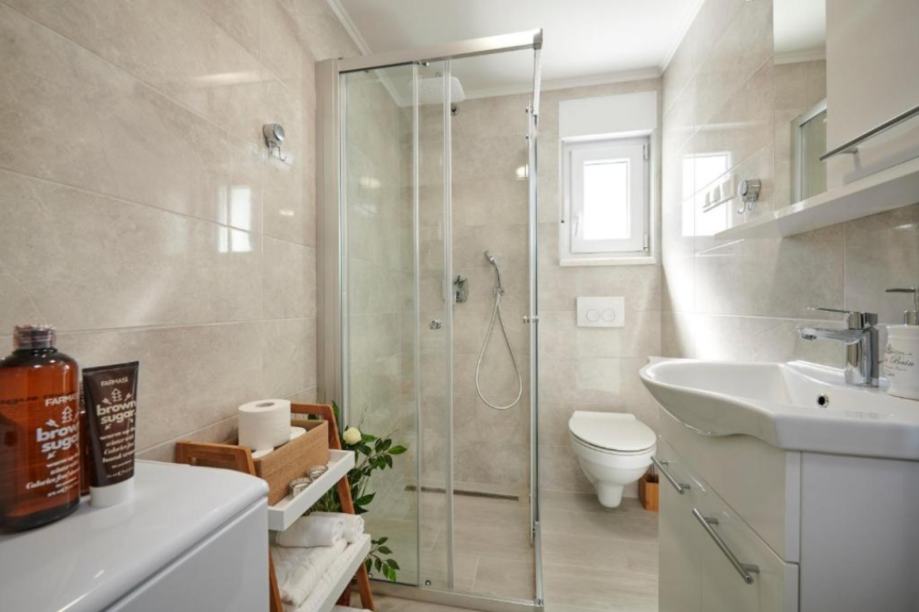 1 KAT: 80m2 (kuhinja, dnevni dio, blagovaonica, 2 spavaće sobe, 2 kupaonice + 20m2 terasa)
