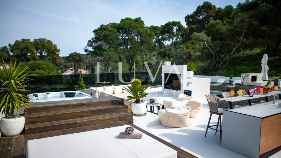Najveća posebnost ove vile je prostrana krovna terasa s bazenom, sunčalištem, modernom ljetnom kuhinjom, kaminom i vanjskim dnevnim boravkom. Poseban doživljaj pruža Jacuzzi, idealan za opuštanje uz zalazak sunca i pogled na more.