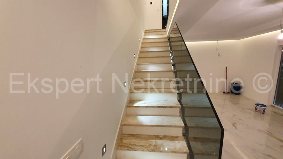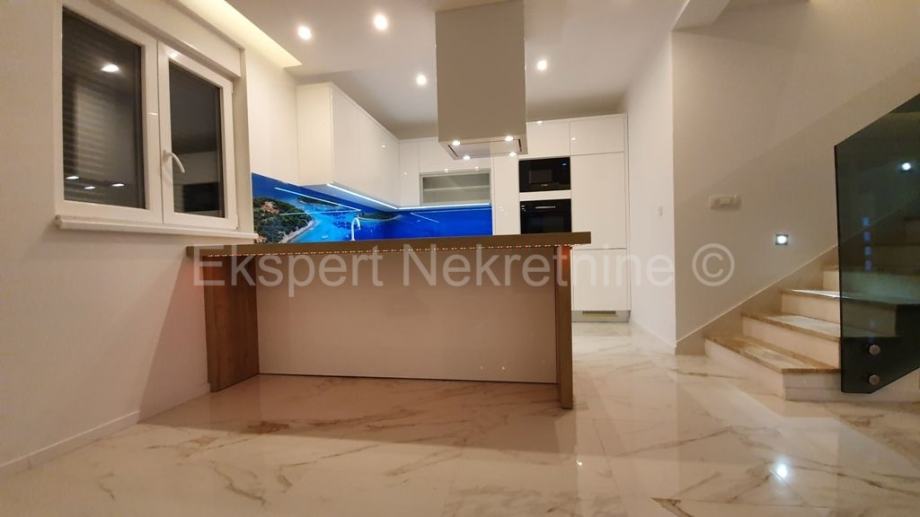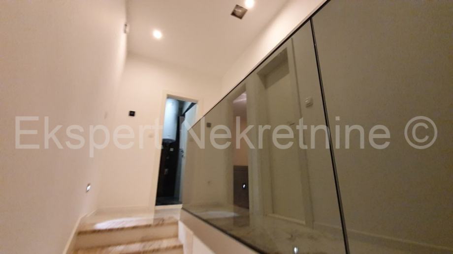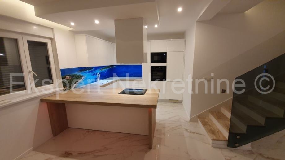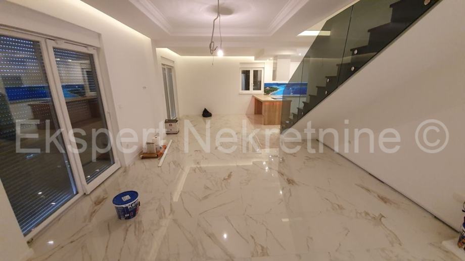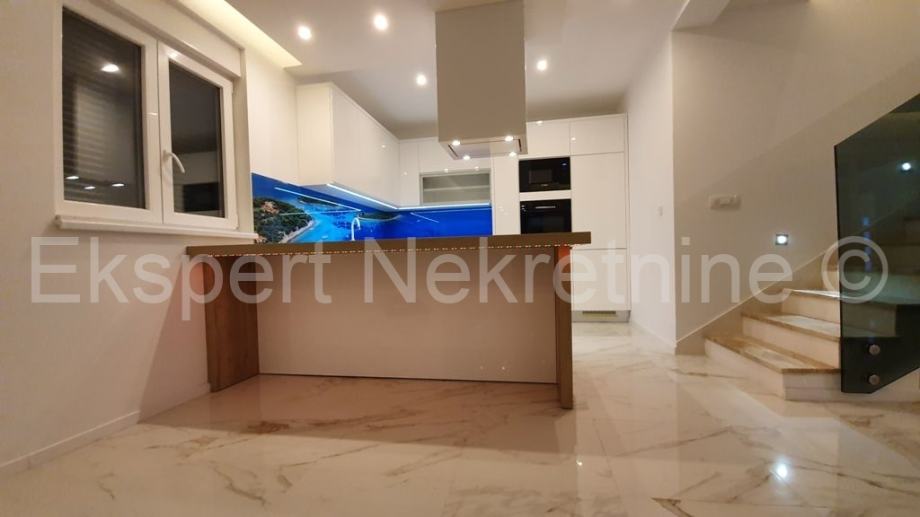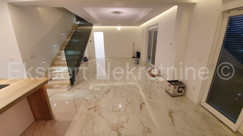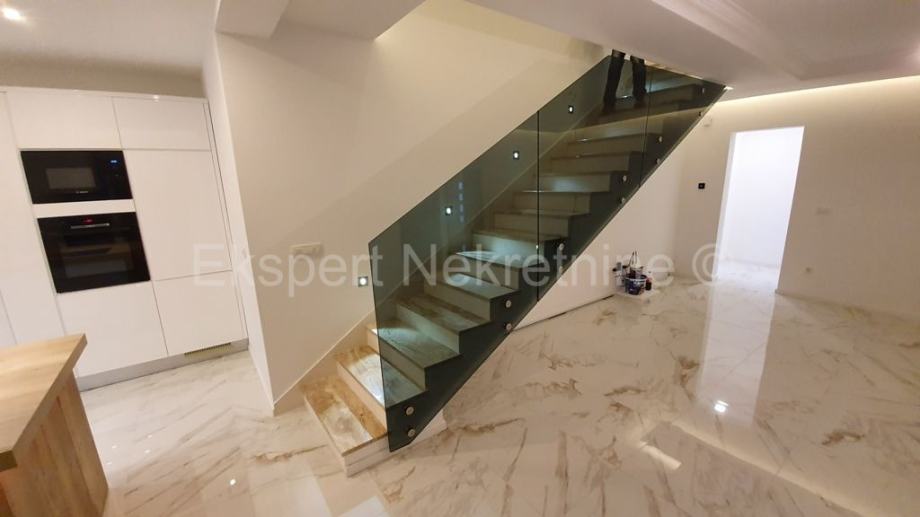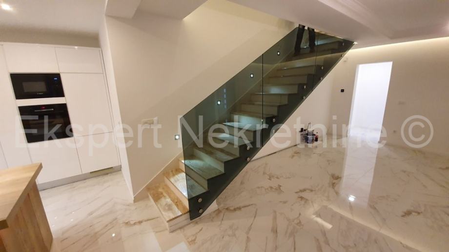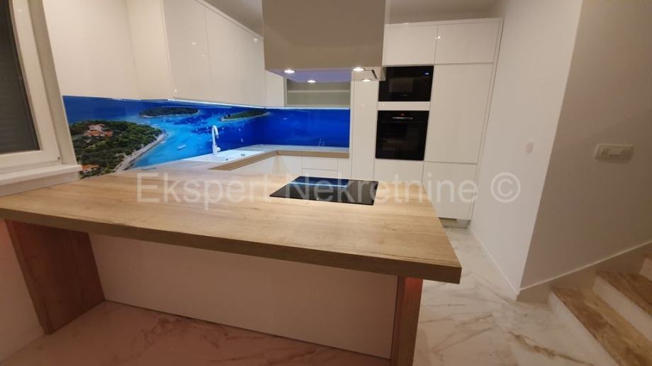 Trogir,luksuzan dvoetažan 2-soban stan 114 m2 s vrtom 100 m2, novogradnja,u zgradi sa samo dva stana.Na prizemlju zgrade se nalazi kupatilo,hodnik,velika kuhinja(sa novoopremljenom kuhinjom) sa blagovaonicom i veliki dnevni boravak iz kojeg ima izlaz u veliki vrt (100 m2) te unutarnje stepenište kojim se penje na drugu etažu na kojoj se nalaze dvije spavaće sobe od kojih jedna sa velikim vlastitim kupatilom i lođom sa koje ima pogled na more i grad,još jedno kupatilo,te praonica sa strojarnicom za solare i centralnim bojlerom .Stan je opremljen vrlo kvalitetnim materijalima i opremom,(stolarija s tri stakla i daljinskim podizanjem roleta,stepenište od kvalitetnog kamena,staklena ograda stubišta i lođe,cijeli stan je opremljen led trakama i led rasvjetom,knaufom dizajniran plafon,kvalitetna keramika itd..).Stan se prodaje sa novim namještajem.Stanu pripadaju i dva vanjska parking mjesta te ograđeni vrt površine 100 m2.Stan ima zaseban ulaz te je spojen na gradsku kanalizaciju.Odmah useljiv.