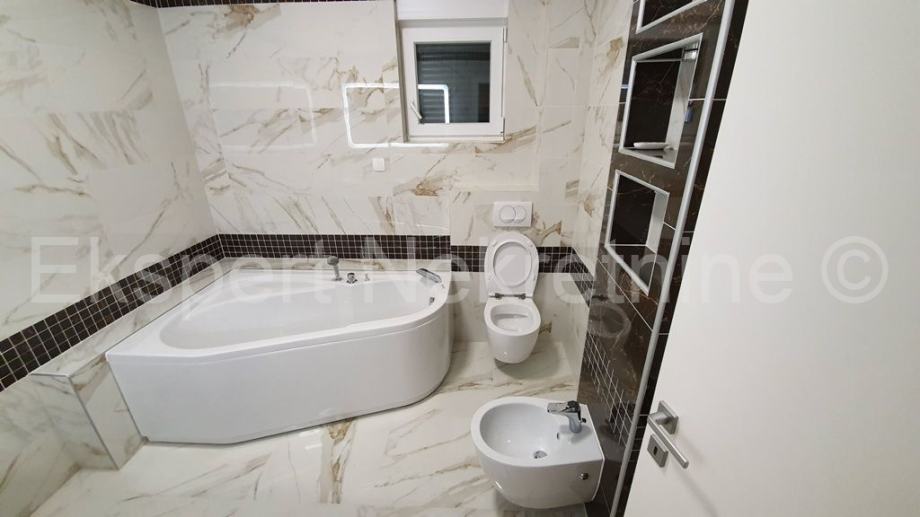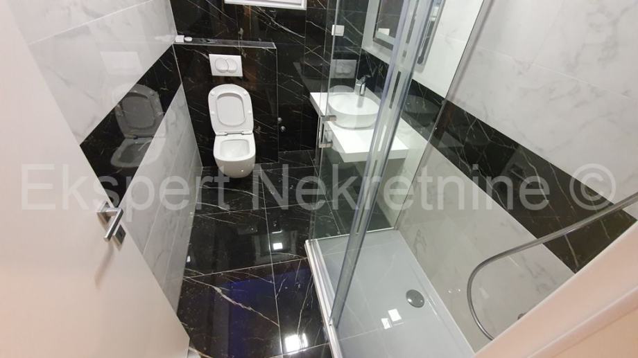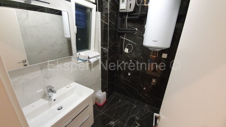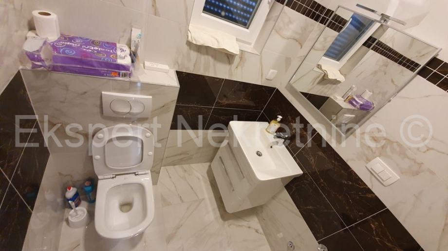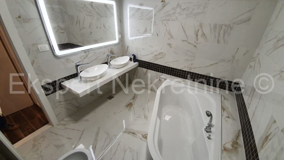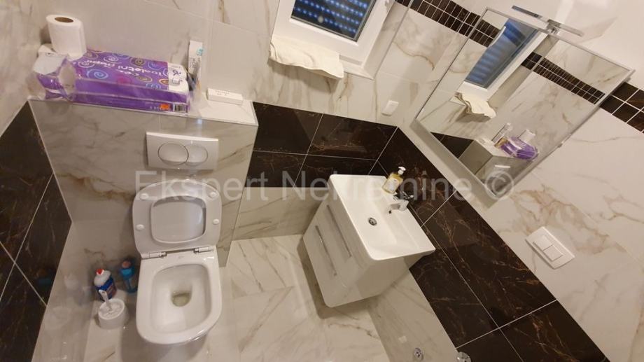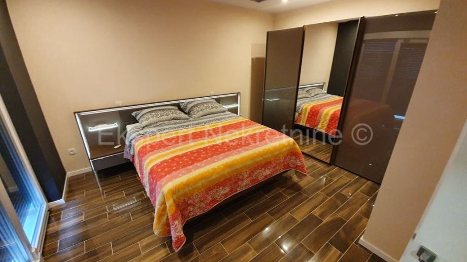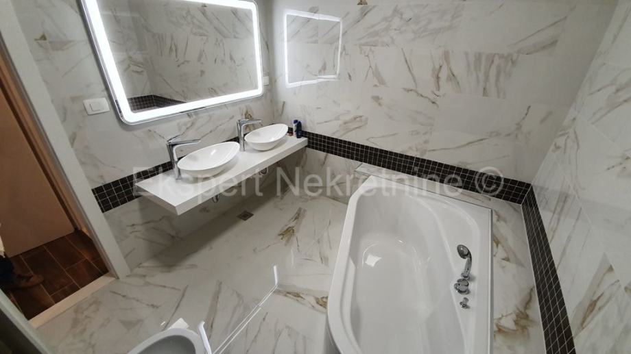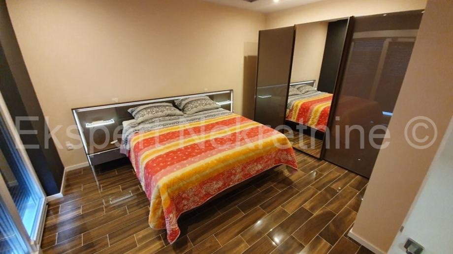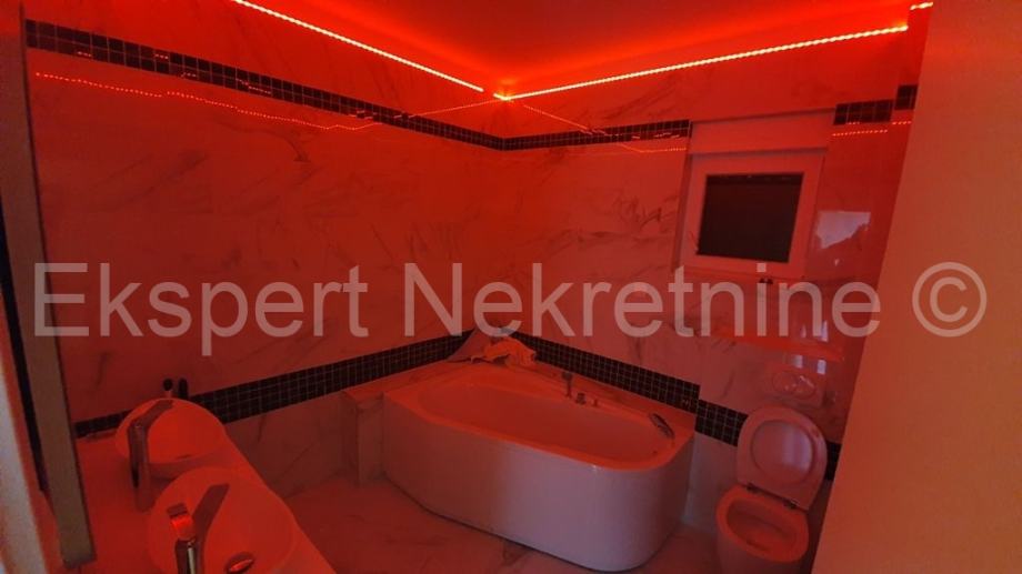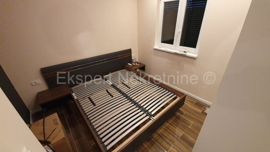 Trogir,luksuzan dvoetažan 2-soban stan 114 m2 s vrtom 100 m2, novogradnja,u zgradi sa samo dva stana.Na prizemlju zgrade se nalazi kupatilo,hodnik,velika kuhinja(sa novoopremljenom kuhinjom) sa blagovaonicom i veliki dnevni boravak iz kojeg ima izlaz u veliki vrt (100 m2) te unutarnje stepenište kojim se penje na drugu etažu na kojoj se nalaze dvije spavaće sobe od kojih jedna sa velikim vlastitim kupatilom i lođom sa koje ima pogled na more i grad,još jedno kupatilo,te praonica sa strojarnicom za solare i centralnim bojlerom .Stan je opremljen vrlo kvalitetnim materijalima i opremom,(stolarija s tri stakla i daljinskim podizanjem roleta,stepenište od kvalitetnog kamena,staklena ograda stubišta i lođe,cijeli stan je opremljen led trakama i led rasvjetom,knaufom dizajniran plafon,kvalitetna keramika itd..).Stan se prodaje sa novim namještajem.Stanu pripadaju i dva vanjska parking mjesta te ograđeni vrt površine 100 m2.Stan ima zaseban ulaz te je spojen na gradsku kanalizaciju.Odmah useljiv.