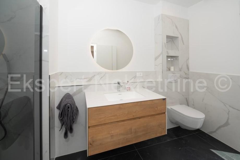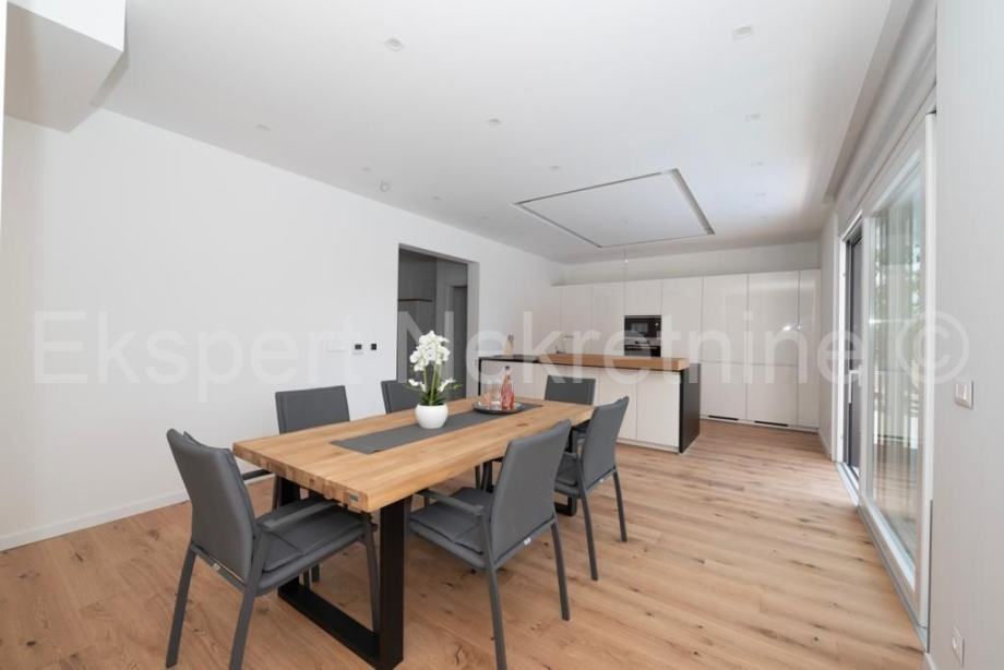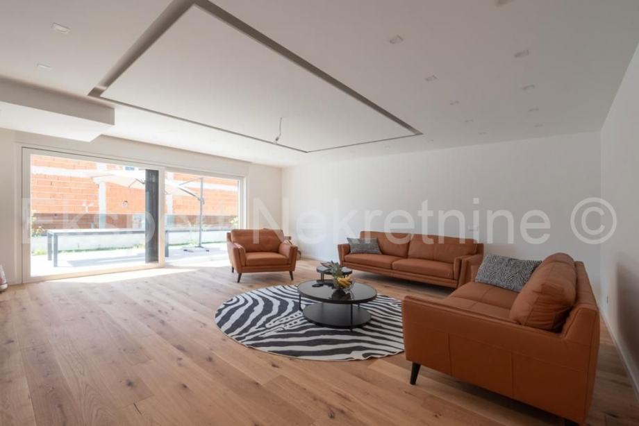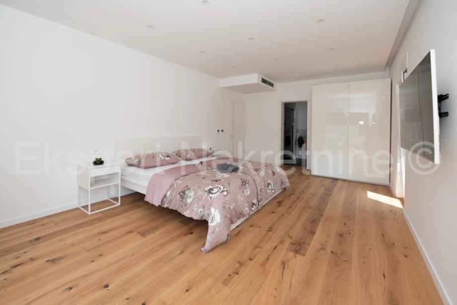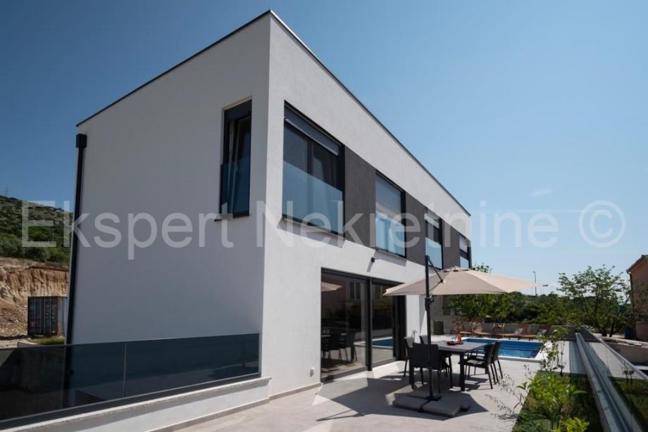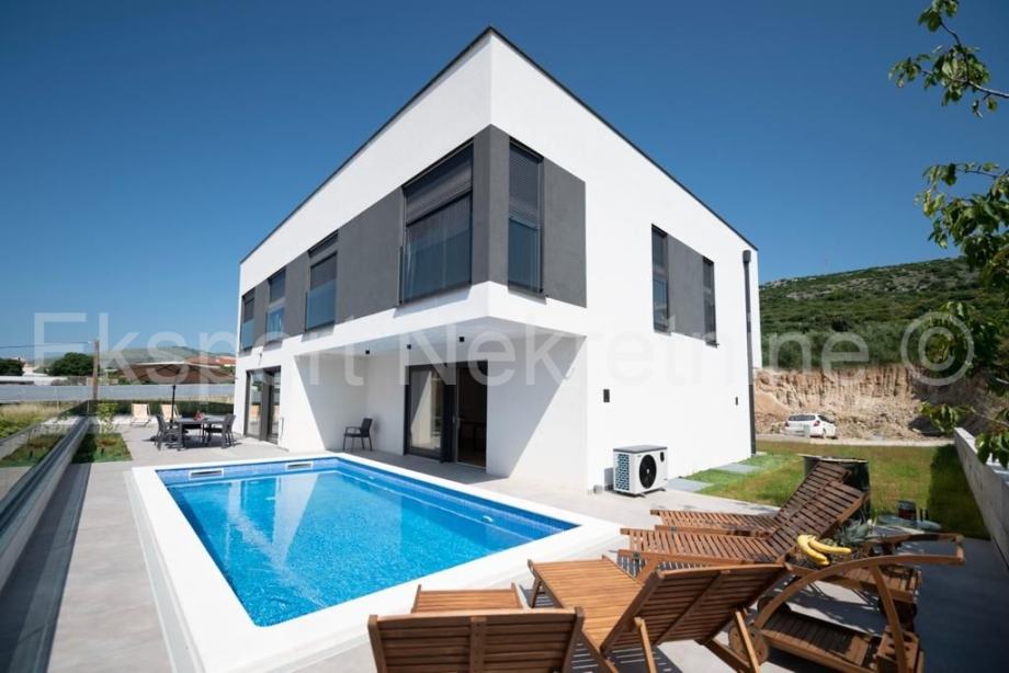 Trogir, luksuzna villa 340 m2 sa bazenom u novogradnji na mirnoj lokaciji sa lijepim pogledom na more .Villa se nalazi na parceli od 510 m2.Na suterenu se nalazi dupla garaža,sa prostorijama za saunu,jacuzzi i prostorom za druženje te wc-om,dok se na prizemlju nalazi kupatilo,hodnik,unutarnje stubište te velika kuhinja s blagovaonicom i veliki dnevni boravak te velika vanjska terasa sa bazenom.Na 1.katu se nalaze 4 spavaće sobe,sa dva kupatila.Cijela kuća ima podno grijanje te kanalne stropne klime.Villa je dovršena,ugrađeni su kvalitetni materijali,(vrhunska keramika,pvc stolarija,komarice,grijanje i hlađenje,kompletno nov namještaj itd...) te je odmah useljiva.Mirna i tiha lokacija udaljena od gradske gužve,a opet dovoljno blizu svih sadržaja u svega par stotina metara.Vlasništvo kao i ostala dokumentacija uredni.Za više info kontaktirati agenciju.
