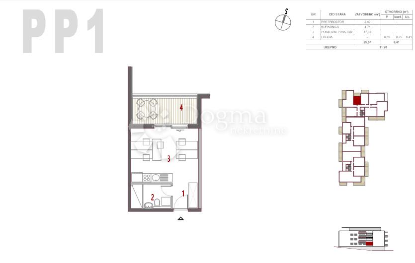 Prostor ima ukupnu površinu od 31.98m2, i sastoji se od pretprostora, poslovnog prostora, kupaonice te loggie.
