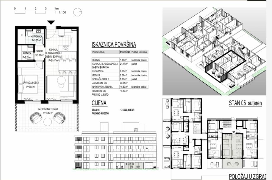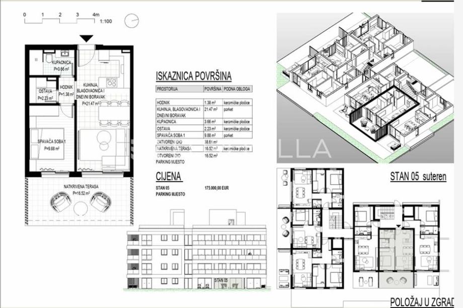 U popularnom odmaralištu srednje Dalmacije, Okrugu Gornjem na Čiovu gradi se stambeni objekta s 24 apartmana na pješačkoj udaljenosti od plaže od 370 m.Objekt se gradi na 5 etaža (jedna podzemna etaža i četiri nadzemne etaže ) uz iskoristivu krovnu terasu koja pripada stanovima na zadnjem katu. Objekt će imati lift.Apartman S5 u prizemlju (u projektu označen kao suteren) orijentacije istok se sastoji od ulaznog prostora od 1,4 m2, dnevnog prostora površine 21,5 m2 (kuhinja, blagovaonica i dnevni boravak), spavaće sobe površine 10 m2, ostave površine 2 m2, kupaonice površine 3,5 m2 i natkrivene terase površine od 16,5 m2.Svi apartmani će biti opremljeni podnim grijanjem i klima uređajima u dnevnom prostoru i jednoj spavaćoj sobi a podne obloge će biti od keramičkih pločica prve klase. Prozori će biti od PVC-a s komaricama i roletama na struju a vanjska fasadna izolacija će biti od stiropora debljine 10 cm.U fazi izgradnje još je moguće dogovarati uređenje interijera.Za svaki apartman u prizemlju je predviđeno jedno vanjsko parking mjesto.Očekivani početak radova je ljeto 2026 godine a useljenje početak 2028 godine. Trenutačno se primaju rezervacije a nakon početka radova potpisuje se predugovor.Način plaćanja: rezervacija min 5.000 eura / 30 % prilikom potpisa predugovora / 30 % nakon završetka konstrukcijskih radova / 15 % nakon završetka fasade / 15 % nakon završetka unutrašnjosti / 10 % nakon ishođenja uporabne dozvole.Kako je otok Čiovo svojevrstan produžetak grada Trogira, nudi pregršt mogućnosti za odmor, rekreaciju i kupanje te razgledavanje mnogobrojnih povijesnih spomenika.Mediteranska vegetacija, arhipelag s malim slikovitim otočićima, blaga klima i predivne plaže u skrovitim zaljevima čine ovo mjesto poželjnom destinacijom za stanovanje I odmor.Dodatne informacije - udaljenosti od važnijih lokacija:Plaža: 370 m / Trogir: 4,5 km / zračna luka: 8 km / Split: 30 kmKupovina: 150 m / restoran: 150 m / ljekarna: 200 m / banka: 300 mZa sva dodatna pitanja stojim na raspolaganju....Za ovu nekretninu kontaktirajte agenta na broj telefona +385 99 400 6073.Više na Eurovilla.hr, ID: 406822Direktan link: https://eurovilla.hr/nekretnina/trogir-okrug-gornji-apartman-s5-u-izgradnji-neto-korisne-povrsine-46-80-m2/406822/-----... For this property contact our agent on telephone number +385 99 400 6073.More on Eurovilla.hr, ID: 406822Direct link: https://eurovilla.hr/en/property/trogir-okrug-gornji-apartment-s5-under-construction-with-a-net-usable-area-of-46-80-m2/406822/...