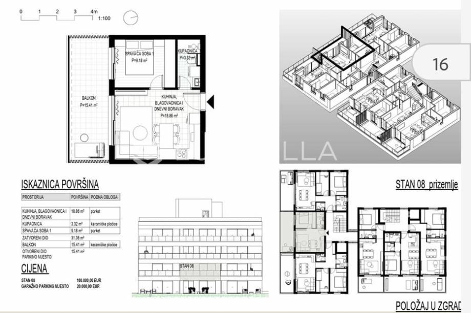 U popularnom odmaralištu srednje Dalmacije, Okrugu Gornjem na Čiovu gradi se stambeni objekta s 24 apartmana na pješačkoj udaljenosti od plaže od 370 m.Objekt se gradi na 5 etaža (jedna podzemna etaža i četiri nadzemne etaže ) uz iskoristivu krovnu terasu koja pripada stanovima na zadnjem katu. Objekt će imati lift.Apartman S8 na prvom katu (u projektu označen kao prizemlje) orijentacije jug se sastoji od dnevnog prostora površine 18,8 m2 (kuhinja, blagovaonica i dnevni boravak), spavaće sobe površina 9 m2, kupaonice površine 3,3 m2 i natkrivene terase površine 15 m2.Svi apartmani će biti opremljeni podnim grijanjem i klima uređajima u dnevnom prostoru i jednoj spavaćoj sobi a podne obloge će biti od keramičkih pločica prve klase. Prozori će biti od PVC-a s komaricama i roletama na struju a vanjska fasadna izolacija će biti od stiropora debljine 10 cm.U fazi izgradnje još je moguće dogovarati uređenje interijera.Apartmanu S8 pripada garažno parking mjesto po cijeni od 20.000 eura.Očekivani početak radova je ljeto 2026 godine a useljenje početak 2028 godine. Trenutačno se primaju rezervacije a nakon početka radova potpisuje se predugovor.Način plaćanja: rezervacija min 5.000 eura / 30 % prilikom potpisa predugovora / 30 % nakon završetka konstrukcijskih radova / 15 % nakon završetka fasade / 15 % nakon završetka unutrašnjosti / 10 % nakon ishođenja uporabne dozvole.Kako je otok Čiovo svojevrstan produžetak grada Trogira, nudi pregršt mogućnosti za odmor, rekreaciju i kupanje te razgledavanje mnogobrojnih povijesnih spomenika.Mediteranska vegetacija, arhipelag s malim slikovitim otočićima, blaga klima i predivne plaže u skrovitim zaljevima čine ovo mjesto poželjnom destinacijom za stanovanje I odmor.Dodatne informacije - udaljenosti od važnijih lokacija:Plaža: 370 m / Trogir: 4,5 km / zračna luka: 8 km / Split: 30 kmKupovina: 150 m / restoran: 150 m / ljekarna: 200 m / banka: 300 mZa sva dodatna pitanja stojim na raspolaganju....Za ovu nekretninu kontaktirajte agenta na broj telefona +385 99 400 6073.Više na Eurovilla.hr, ID: 635422Direktan link: https://eurovilla.hr/nekretnina/trogir-okrug-gornji-apartman-s8-na-prvom-katu-neto-korisne-povrsine-39-m2/635422/-----... For this property contact our agent on telephone number +385 99 400 6073.More on Eurovilla.hr, ID: 635422Direct link: https://eurovilla.hr/en/property/trogir-okrug-gornji-apartment-s8-on-the-first-floor-with-a-net-usable-area-of-39-m2/635422/...