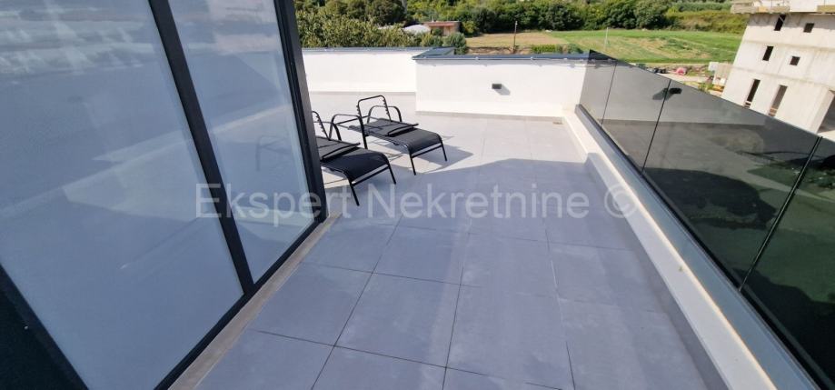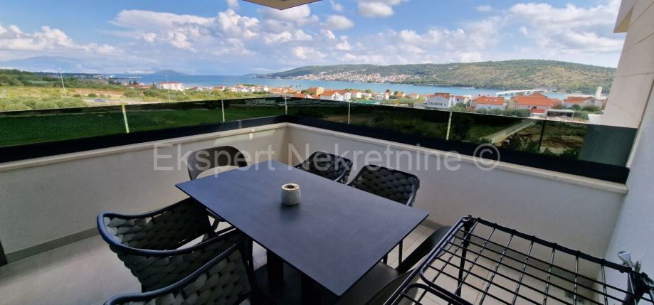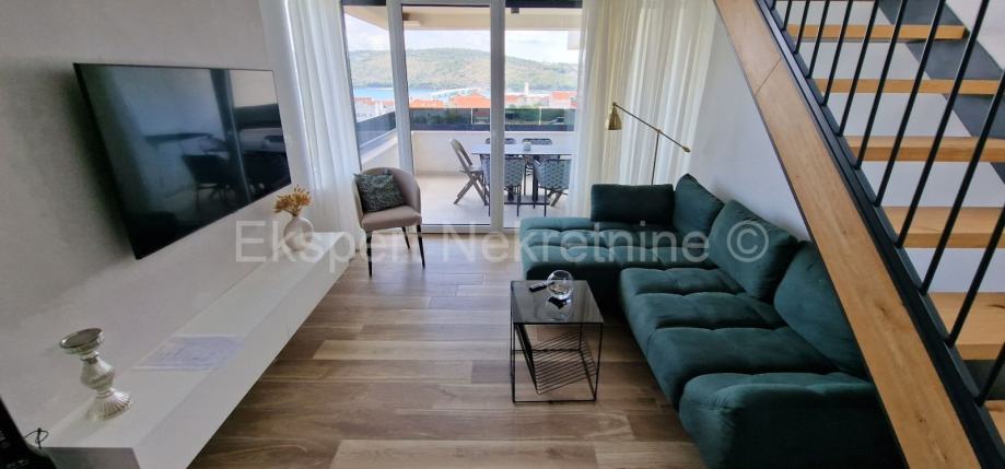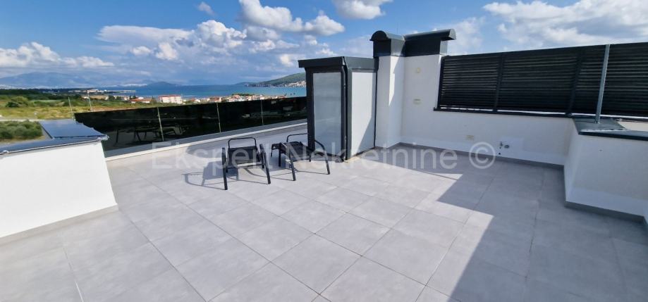 Trogir, luksuzan penthouse 70 m2 + 75 m2 krovne terase na drugom(zadnjem) katu novije zgrade (2021g.) s pogledom na more. .Stan se sastoji od hodnika,dvije spavaće sobe od kojih jedna sa vlastitim balkonom,kupatila,mali wc,kuhinje, blagovaonice i dnevnog boravka te velike lođe (15m2) i unutarnjih stepenica koje vode na veliku krovnu terasu (75m2) sa kojeg se pruža neometan pogled na more i okolicu.Stan je vrhunski sređen i kompletno opremljen novim i modernim namještajem sa svim uređajima.Stan ima podno grijanje ,klime u svakoj prostoriji,walk in tuš,kompletno opremljena kuhinju,kvalitetna keramika i parket,protuprovalna i protupožarna vrata,itd... Pripadaju mu i do 6 vanjskih parking mjesta.Nalazi se samo 600 m od mora i plaže te 1.2 km od centra grada.Mirna lokacija.Dobar pristup.
