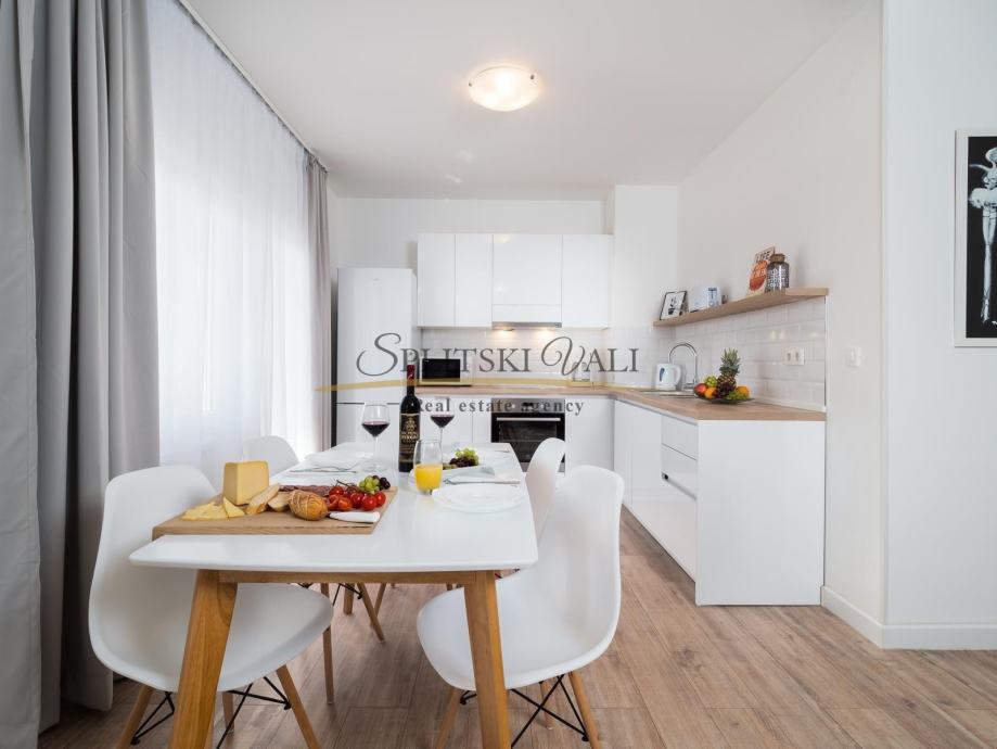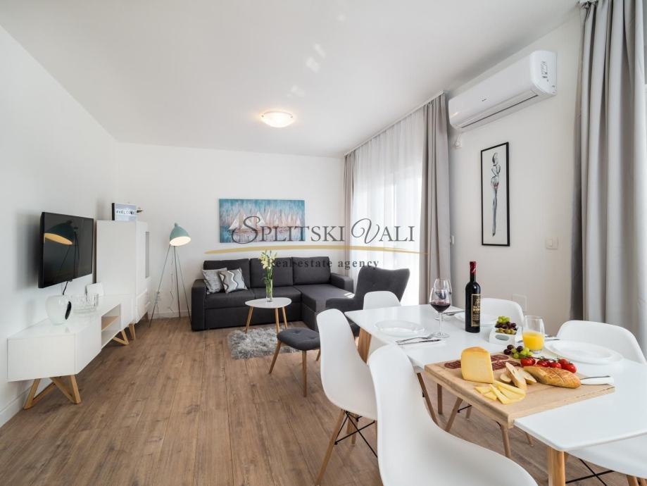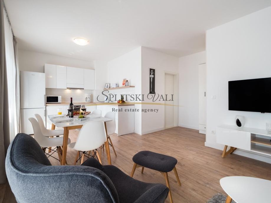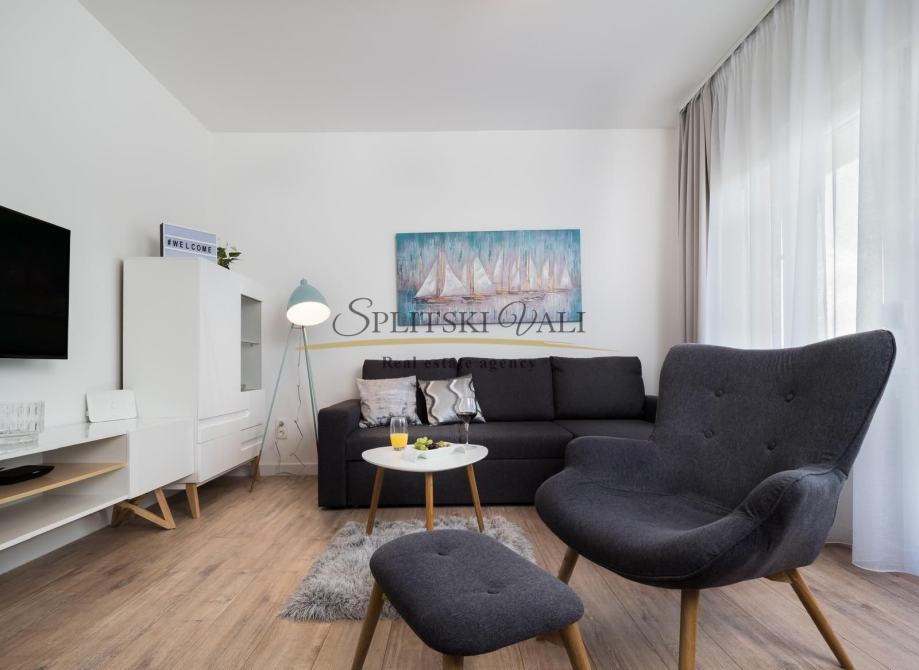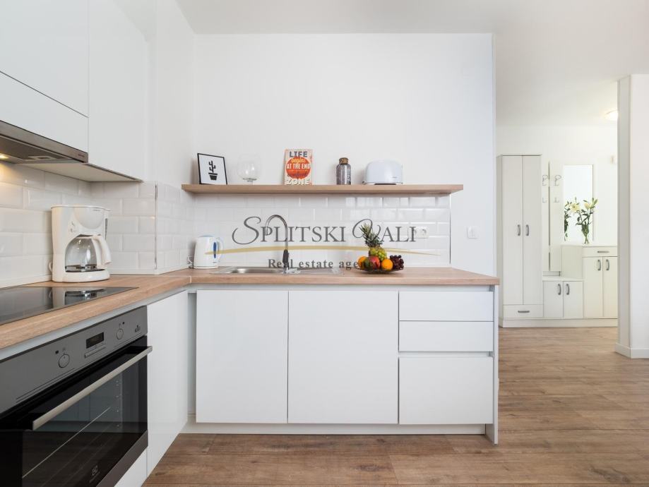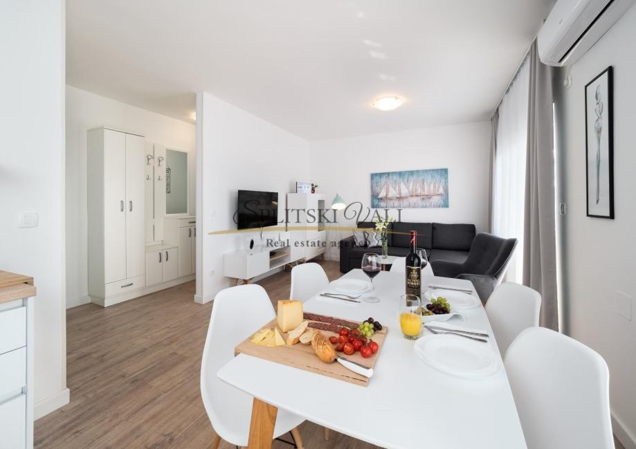 Stan se proteže na 63,18m2 i sastoji od kuhinje, blagovaone, dnevnog boravka, spavaće sobe, drvarnice i lođe s koje se pruža prekrasan, otvoreni pogled na grad i more.