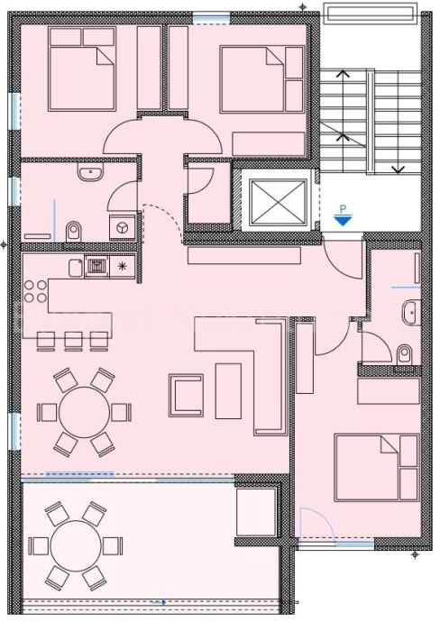Trogir,Saldun,trosoban stan 103 m2 (84m2+19m2 lođe) sa jednim parkingom ,u novogradnji sa zajedničkim bazenom i liftom.Stan se nalazi na prvom katu zgrade,orijentiran je jugozapad-sjeveroistok-sjeverozapad a sastoji se od tri spavaće sobe,dva kupatila,ostave, hodnika,kuhinje sa blagovaonicom idnevnim boravkom te velike lođe (19 m2) sa koje ima otvoren pogled na more.