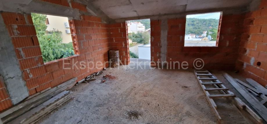 Trogir,Saldun,nedovršena samostojeća apartmanska kuća 487 m2,sa 5 apartmana a svi apartmani imaju neometan pogled na more. Kuća je u roh-bau izvedbi sa postavljenom stolarijom i djelomićno položenim instalacijama.Kuća se nalazi na parceli od 414 m2,ima 4 etaže (prizemlje + 3 kata).Na prizemlju se nalaze dvije velike garaže (a mogu biti i apartman) te velika konoba i jedna ostava i kupatilo,dok se na prvom katu nalazi veliki trosobni stan ,a na drugom katu dva manja stana,te opet jedan veliki trosobni stan na trećem(zadnjem) katu.Iz svih stanova ima otvoren pogled na more od kojeg je kuća udaljena samo 200 m.Svi stanovi su povezani stubištem.Kuća se nalazi na mirnoj lokaciji u blizini plaže,kao i centra Trogira.Kuća je legalizirana i ima uredno vlasništvo.Idealno za turistički najam ili prodaju stanova. EKSKLUZIVNA PRODAJA!!