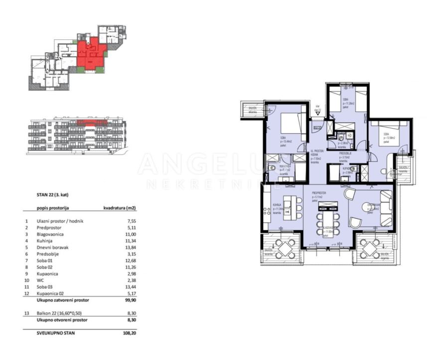 Prodaje se stan ukupne neto površine 108.20 m2, položen na trećem katu prekrasne urbane zgrade s pogledom na more, koja ukupno broji 22 stana. Stan se sastoji se od ulaznog hodnika, predpeostora, kuhinje i blagovaonice s dnevnim boravkom, predsoblja, tri spavaće sobe, dvije kupaonice, wc-a i balkona sa kojeg se pruža prekrasan pogled na more i obližnje otoke. Gradnja se izvodi prema najnovijim standardima koji uključuju kvalitetne materijale i opremu po sistemu „ključ u ruke“, koja uključuje: prvoklasnu hidro i termo izolaciju, protuprovalna i protupožarna vrata u modernoj izvedbi, kvalitetnu unutarnju stolariju, elegantne pločice i drveni pod, ugrađeno podno grijanje u kupaonicama. Stanu pripadaju i dva parkirno mjesto. Očekivani rok dovršetka zgrade je Rujan 2024. godine.