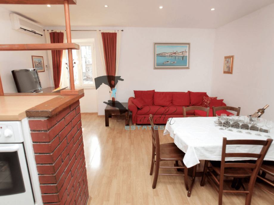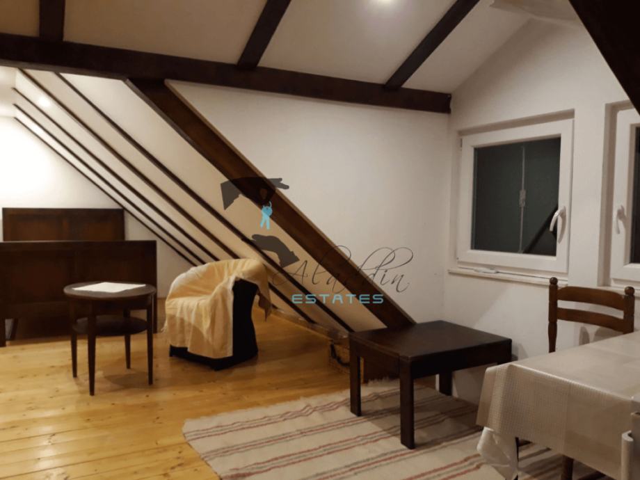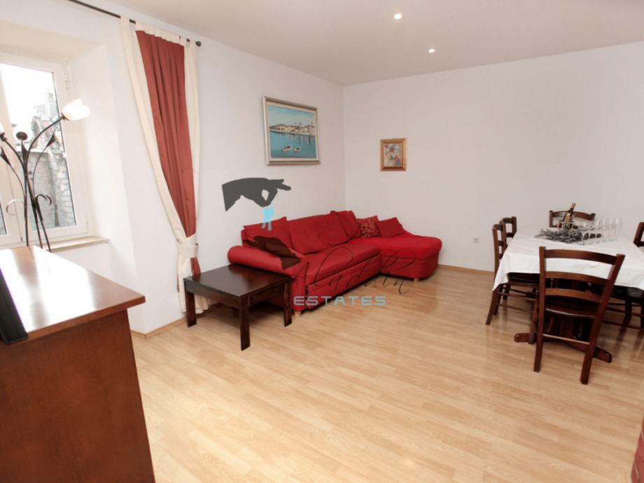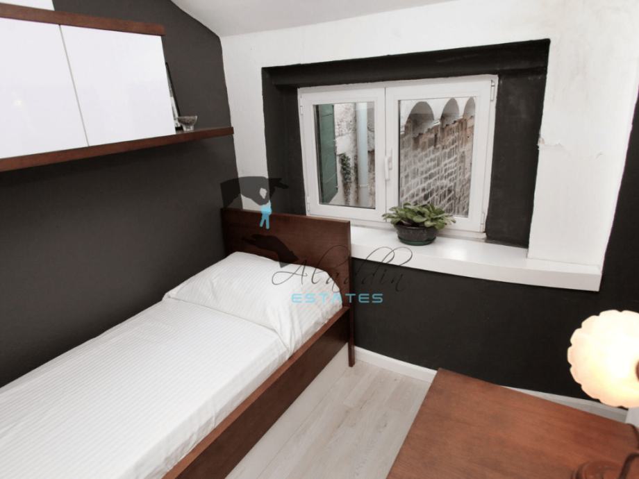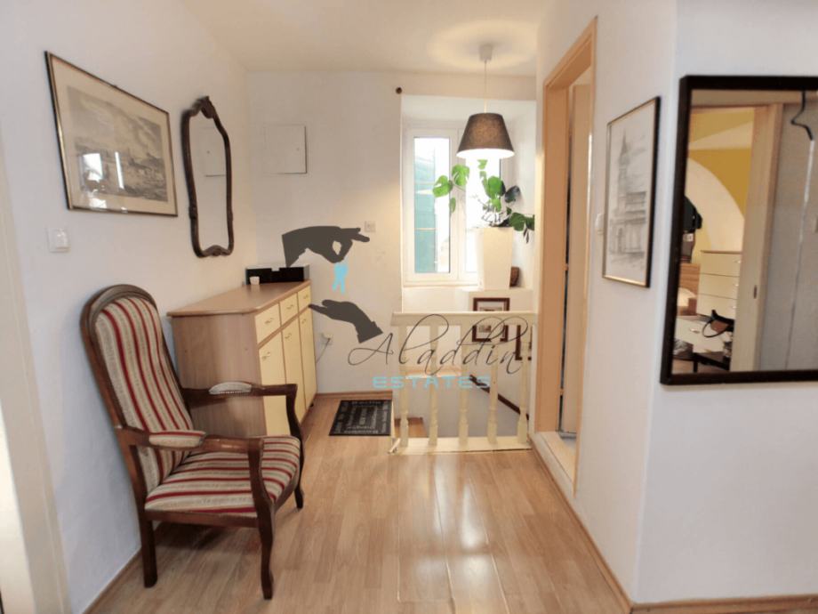 Renovated two-level five-bedroom apartment with a total net area of 110.19 m2 is located on the second floor and in the attic of a stone building in the old town near the Cathedral, in the center of Trogir, and in a quiet environment of old city streets.