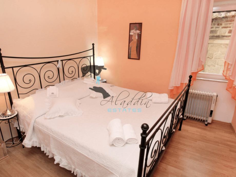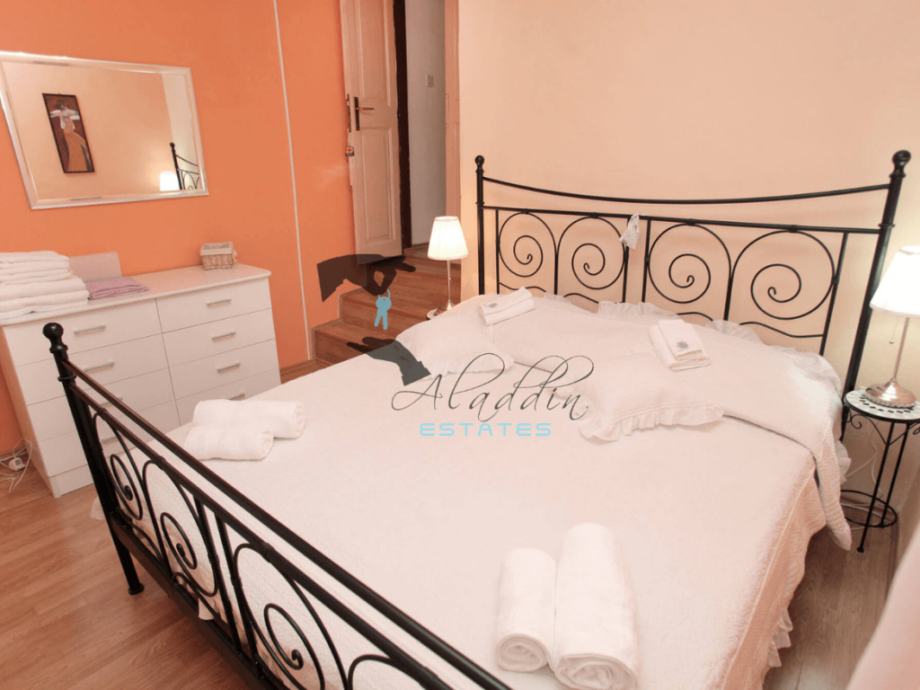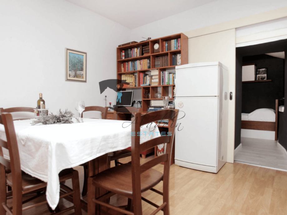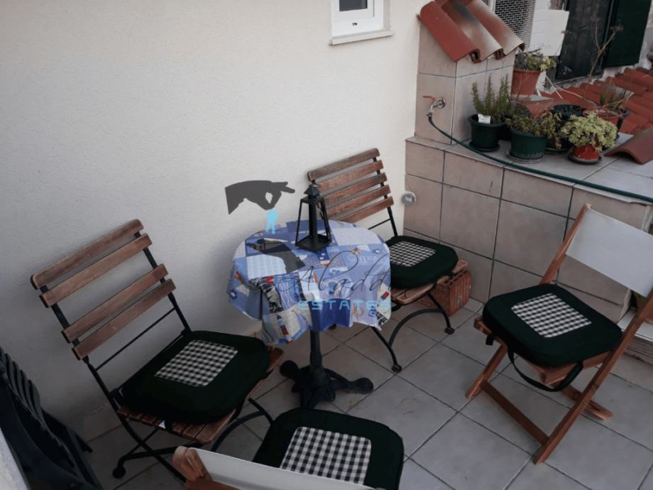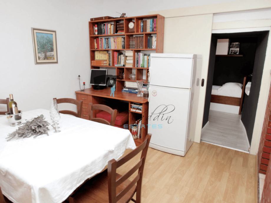 Renovated two-level five-bedroom apartment with a total net area of 110.19 m2 is located on the second floor and in the attic of a stone building in the old town near the Cathedral, in the center of Trogir, and in a quiet environment of old city streets.