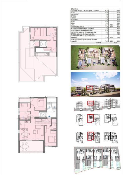 Stan drugi kat: 80.55 m2 unutarnji prostor, 18.05 m2 lođa, 2.75 m2 natkrivena terasa, 26.90 m2 unutarnji prostor nadgrađe, 4.80 m2 natkrivena terasa nadgrađe, 76.20 m2 nenatkrivena terasa nadgrađe, 16 m2 garažno mjesto, za 151.81 m2 neto stambenog prostora s koeficijentima, po cijeni od €737.063.